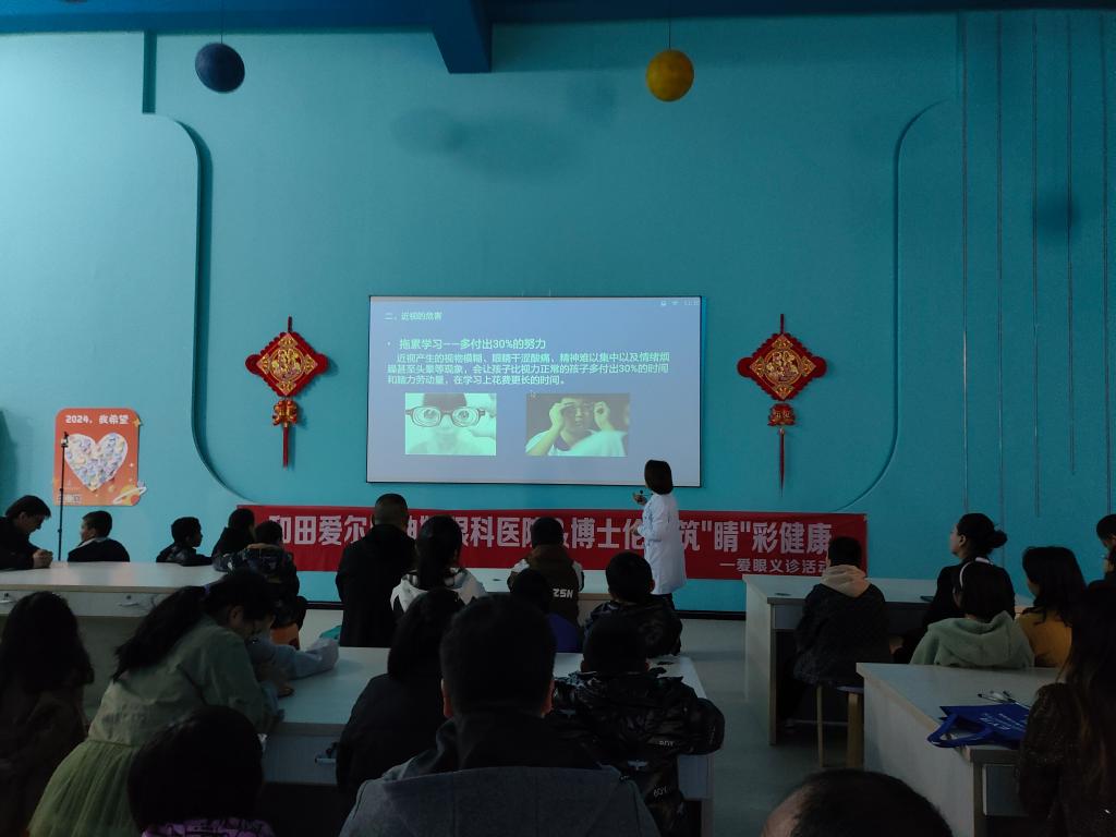 2024年3月10日,和田地區科協聯合和田愛爾阿迪婭眼科醫院舉辦了一場以“呵護眼部健康 擁抱光明未來”為主題的青少年近視防控親子科普活動。此次活動主要包括科普講座、免費義診,活動進行了線上直播,線上線下共計100余人參與了此次活動。