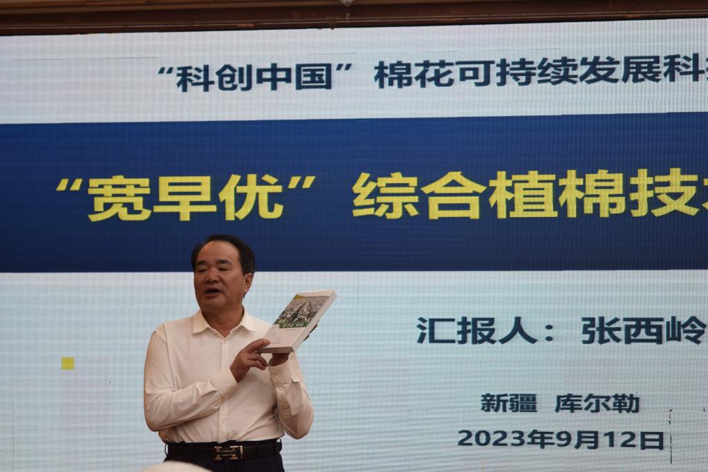 中國農(nóng)業(yè)科學(xué)院棉花研究所副所長、棉花綠色增產(chǎn)增效創(chuàng)新團(tuán)隊首席科學(xué)家、研究員張西嶺作《新疆“寬早優(yōu)”綜合植棉技術(shù)研究與應(yīng)用》主旨報告