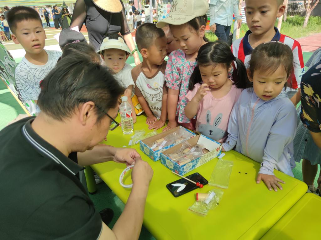 隨后,夏日科學派對在幼兒園的操場上拉開了序幕,夏日綿綿冰、荷塘、彩虹泡泡、竹蟬、水中畫等10余項充滿創(chuàng)意和趣味的科學實驗活動,讓孩子們興奮不已,使他們在動手體驗的過程中感受到了科學的樂趣與魅力。