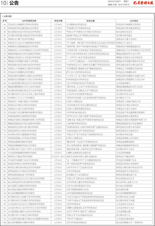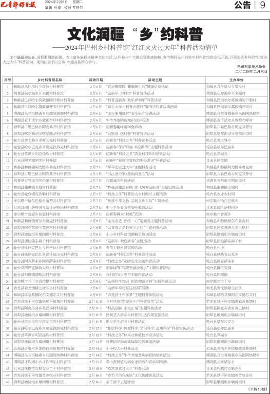 為豐富各族群眾精神文化生活,讓科技與廣大群眾零距離接觸,春節(jié)期間巴州百家鄉(xiāng)村科普館常態(tài)化開放,開展形式多樣的“紅紅火火過大年”科普活動(dòng)。巴州科協(xié)聯(lián)合縣市科協(xié)、各部門單位和鄉(xiāng)鎮(zhèn)村聯(lián)合公布了“文化潤疆 鄉(xiāng)約科普”2024年巴州鄉(xiāng)村科普館紅紅火火過大年活動(dòng)清單,使社會(huì)各界、各族群眾參與到鄉(xiāng)村科普館的各項(xiàng)科普活動(dòng)中。