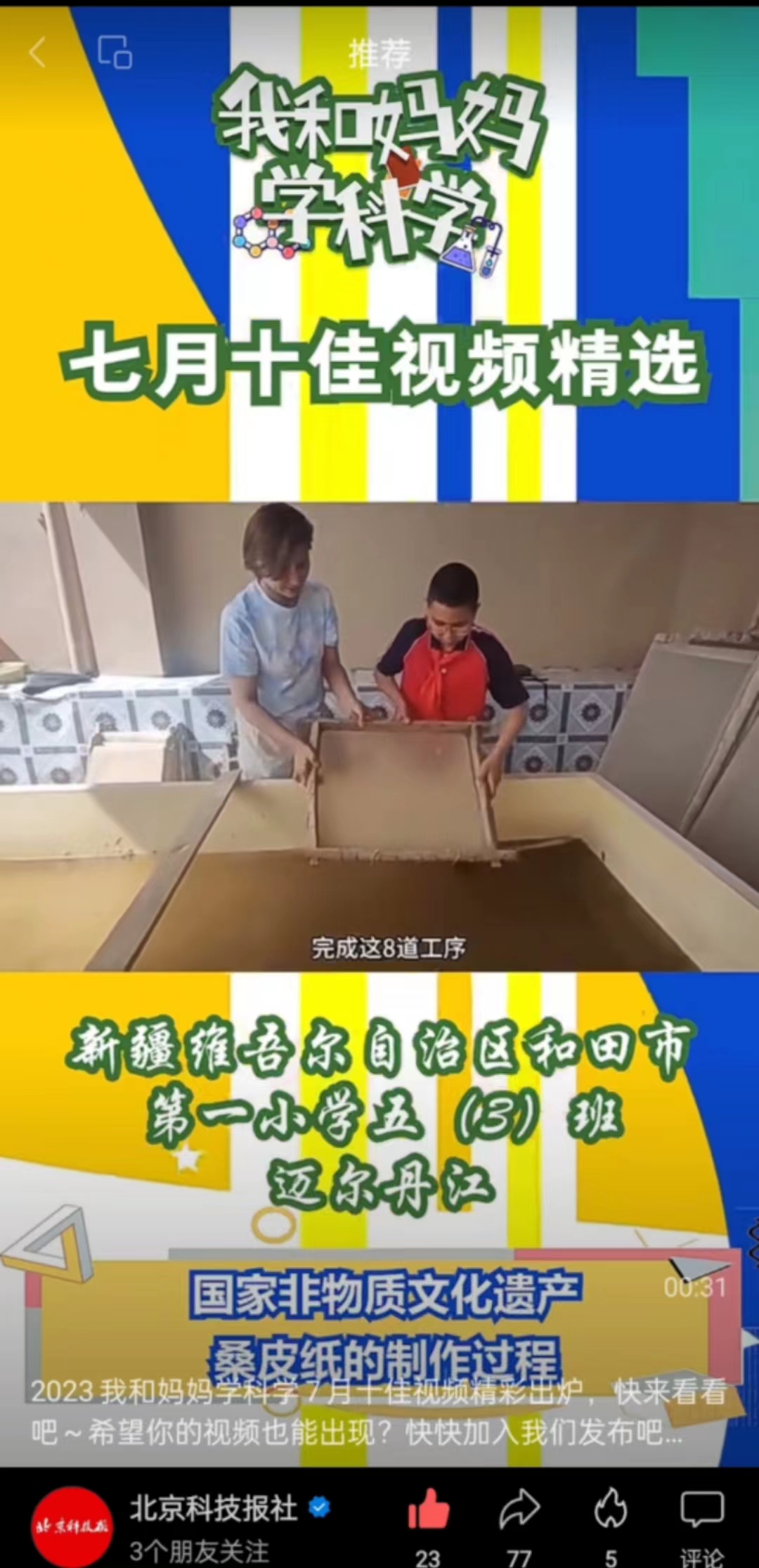 2023年“我和媽媽學科學”7月“全國十佳”視頻評選活動中,和田市第一小學學生的1部視頻被評為“全國十佳”作品。該視頻中,參與者前往有著“桑皮紙之鄉”美譽的墨玉縣普恰克其鄉布達村,依托本地特色文化資源講述了全國非物質文化遺產“桑皮紙”的制作技藝并展開講述了紙的發展歷程,古人的智慧與現代科技碰撞出了別樣的火花。