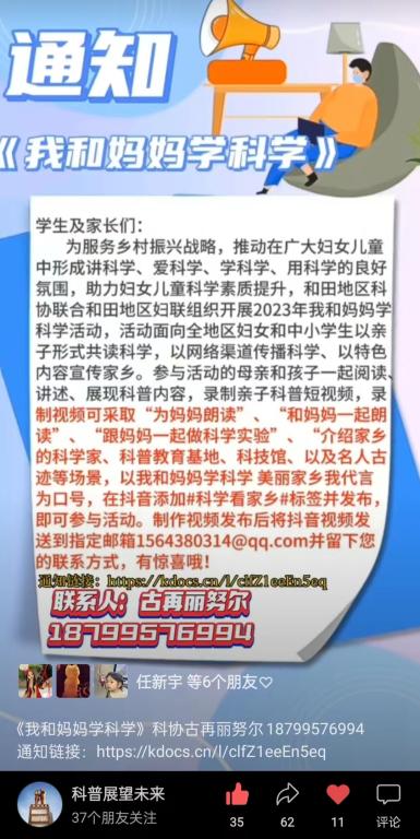 為落實和田地區(qū)科協(xié)《和田地區(qū)全民科學(xué)素質(zhì)行動規(guī)劃綱要實施方案(2021-2035年)》的有關(guān)要求,提高我區(qū)農(nóng)村婦女兒童科學(xué)素質(zhì),服務(wù)鄉(xiāng)村振興戰(zhàn)略,根據(jù)《中國科協(xié)科普部、全國婦聯(lián)宣傳部關(guān)于開展2023年“我和媽媽學(xué)科學(xué)”活動的通知》(科協(xié)普函基字〔2023〕25號)、《自治區(qū)科協(xié)、自治區(qū)婦聯(lián)關(guān)于開展2023年“我和媽媽學(xué)科學(xué)”活動的通知(新科協(xié)發(fā)〔2023〕69號)要求,和田地區(qū)科協(xié)、和田地區(qū)婦聯(lián)聯(lián)合發(fā)文,攜手動員各縣市科協(xié)、婦聯(lián)積極開展“我和媽媽學(xué)科學(xué)”活動,努力在廣大婦女和青少年中形成講科學(xué)、愛科學(xué)、學(xué)科學(xué)、用科學(xué)的良好氛圍,助力提升婦女、青少年科學(xué)素質(zhì)。