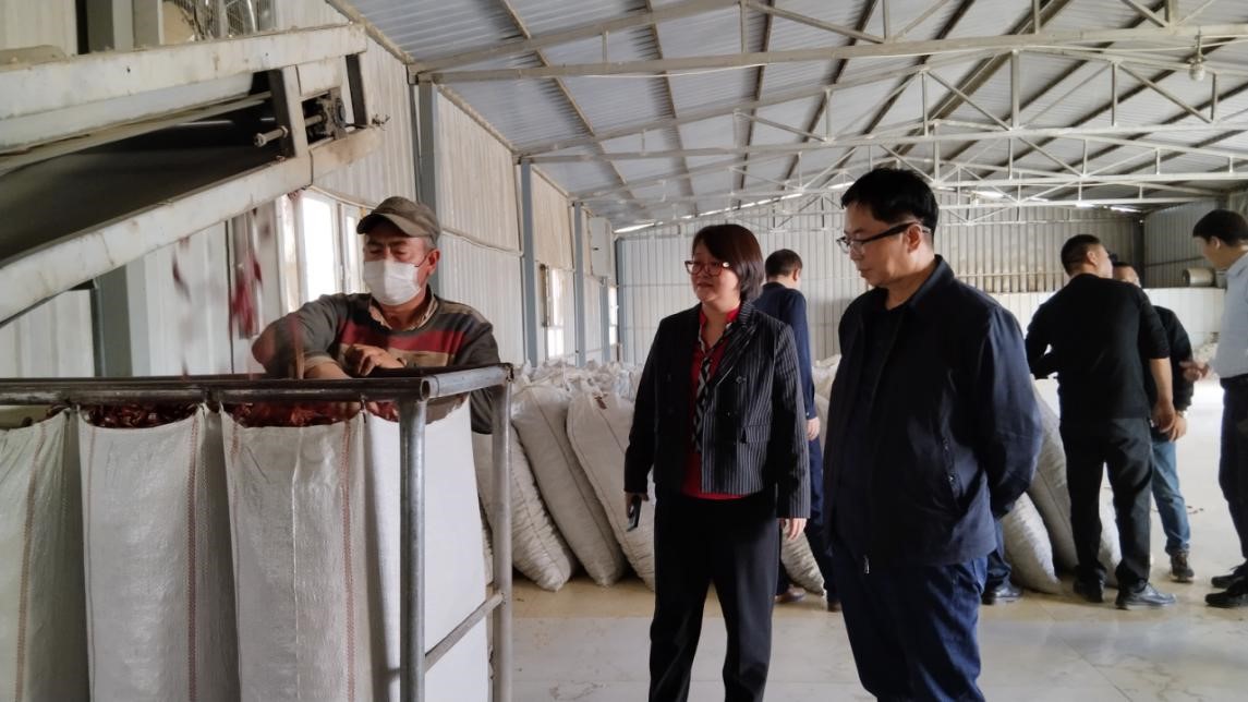 調研組一行在和靜縣工業園辣椒晾曬場、和靜縣浩園辣椒加工廠對辣椒生產及加工情況進行了調研。和靜縣獨特的氣候條件,使得種植的辣椒品質優良,深受疆內外客商青睞,已成為全疆加工辣椒的主要生產基地之一。2023年,和靜縣全縣種植辣椒18萬畝,辣椒獲得大豐收,平均畝產508公斤,最高單產達1050公斤。