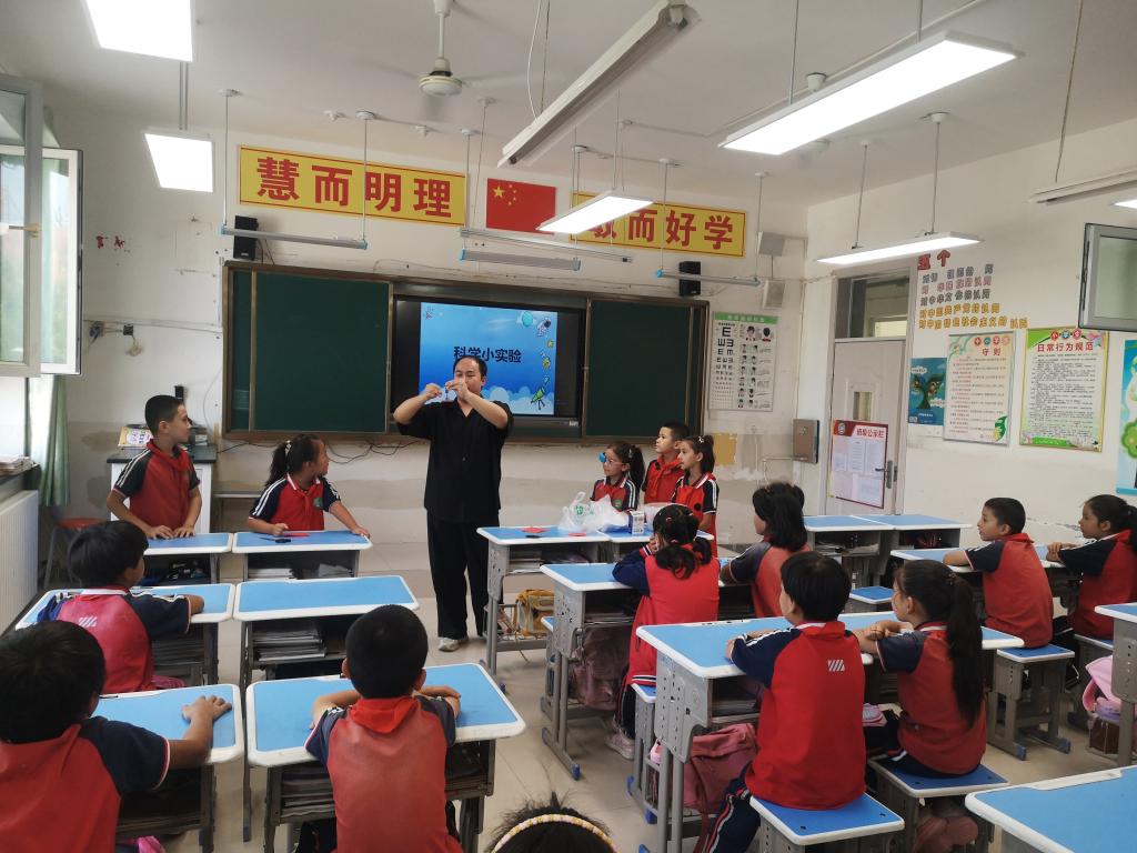 教室課堂上,科技志愿者熱情地與學生們互動,和學生們共同用科普資源包做有趣的物理實驗,同學們踴躍地參與其中。科技志愿者與現場隨機挑選的5位學生一起做了“電磁小風車”實驗,通過磁場對導體的力的作用使風扇轉動這一有趣現象來激發學生對物理的興趣。學生們對實驗過程中的每一步都非常投入,不懂的地方會主動和科技志愿者溝通,此外同學們還觀看了大疆TT無人機編隊表演。學生們暢游在浩瀚的科學海洋當中,歡呼如今科學進步之快,同時也隱隱在心中埋下學習和探索科學的種子。