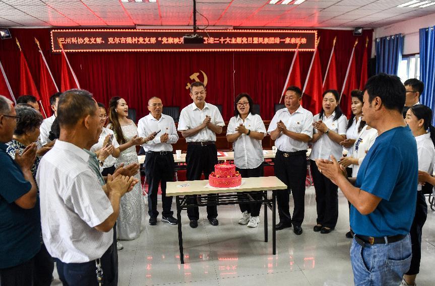 活動在高亢的“中華人民共和國國歌”歌聲中拉開序幕,全體黨員在黨旗下重溫入黨誓詞、開展專題學(xué)習(xí)、為15位黨員過政治生日并為他們贈送政治禮物……按照規(guī)范流程完成主題黨日活動后,正式開展民族團結(jié)聯(lián)誼活動。巴州科協(xié)、克爾古提村黨員干部群眾為聯(lián)誼活動準(zhǔn)備了舞蹈、誦讀、合唱等精彩紛呈的節(jié)目,將活動推向了高潮。