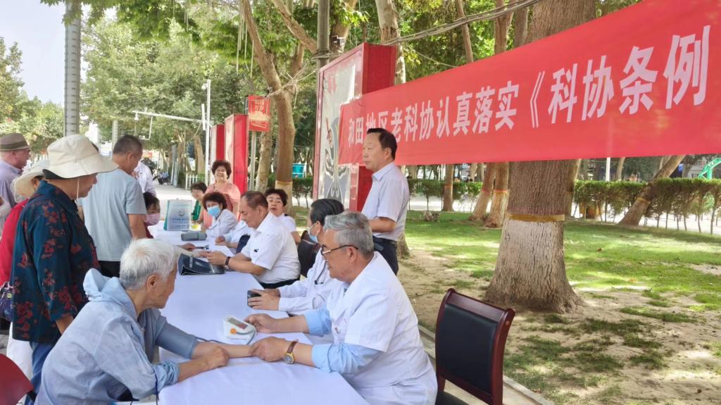 7月9日上午,和田地區科協老年科技工作者協會組織和田地區人民醫院、和田地區維吾爾醫院醫務專家會員在和田市團結廣場開展《新疆維吾爾自治區科學技術協會條例》宣傳暨衛健科普和專家義診活動。