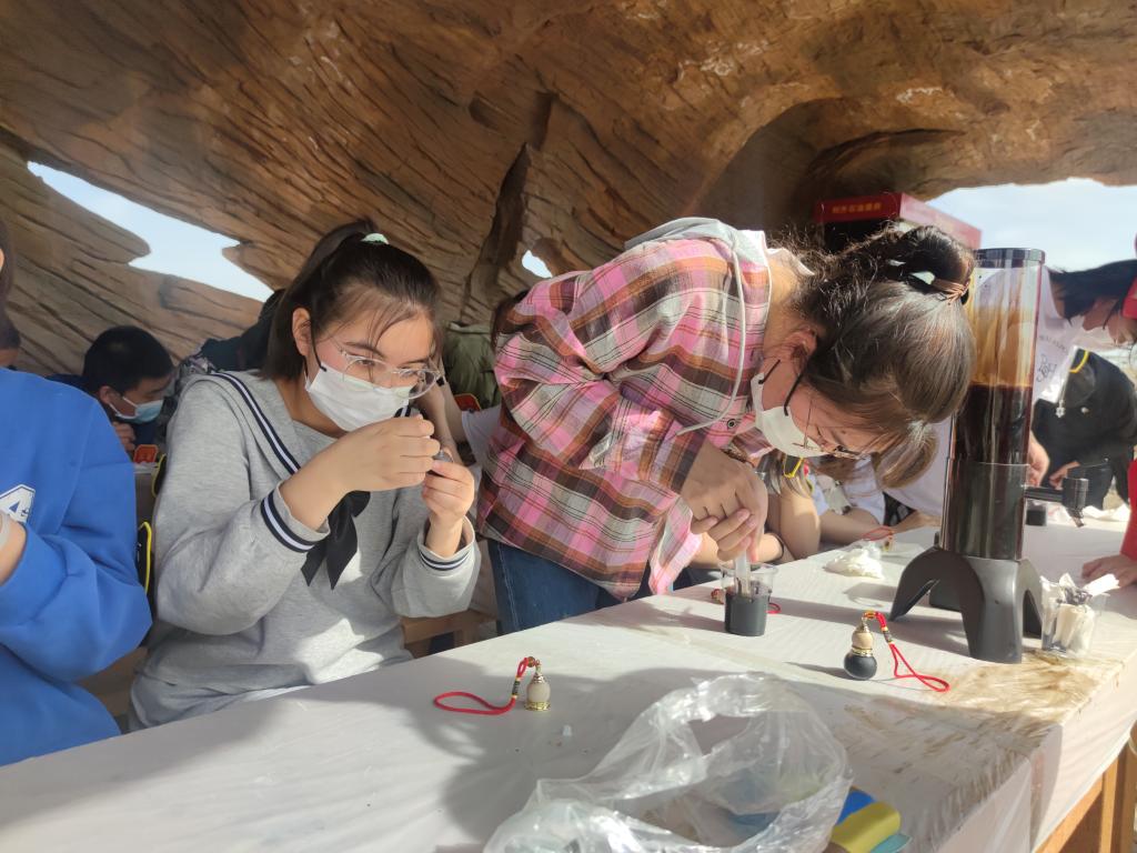 五月一日當天,同學們來到了科普研學第一站:克拉瑪依市科普教育基地——黑油山景區。在黑油山科普教育基地,講解員老師給同學們授予了“1219青年鉆井隊新時代青少年鉆探隊”的隊旗,通過自我推薦及選舉方式推選出大隊長及相關鉆探隊管理人員,并為每一位同學佩戴了隊章并進行了宣誓。同學們循著“1219青年鉆井隊”的足跡,參觀了油井,制作了“油葫蘆”,進行了可樂噴發小實驗,感受了“跳跳泉”,了解了“蒸氣吞吐法”“注水法”“火燒油層法”三種采油方式,同學們探索了石油的奧秘,深刻領悟到老一輩石油人開拓進取,愛國奉獻的精神。下午,同學們來到全國科普教育基地、自治區青少年科技教育基地——克拉瑪依科技館,科技館為同學們精心安排了“探索絲綢之路的秘密”“樂享影視”“科學起跑線—人工智能體驗課程”等四個研學課程,通過場景式、體驗式、互動式、探究式的教學,同學們感受到了科技的神奇魅力,激發了同學們“愛科學、學科學、用科學”的熱情。