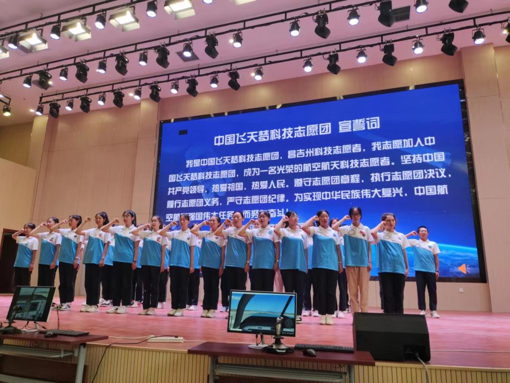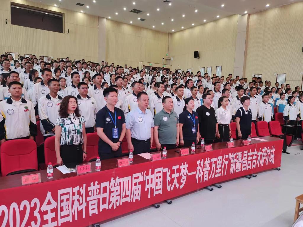啟動儀式上,中國飛天夢科技志愿團副團長張海向吉木薩爾縣支隊進行授旗,30名志愿者代表上臺宣誓加入中國飛天夢科技志愿團。為了給青少年學習了解航空航天知識創造更好的條件,中國教育發展基金會、新東方教育科技集團聯合昌吉州科協,向昌吉州4所幼兒園捐贈科學實驗操作材料600套。最后,巴合達提宣布活動正式開始,拉開了2023全國科普日第四屆“中國飛天夢-科普萬里行”昌吉州吉木薩爾站活動的序幕。