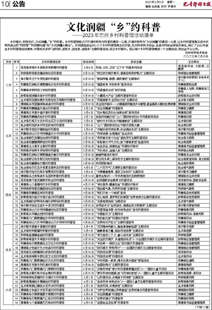 2月6日,巴州科協會同各縣市科協從每個鄉村科普館年度活動安排中精選一個主題活動,形成117個鄉村科普館2023年活動訂單在《巴音郭楞日報》面向社會公布,高位推動年度鄉村科普館活動安排和部署,力爭實現科普陣地服務群眾“開門紅”。