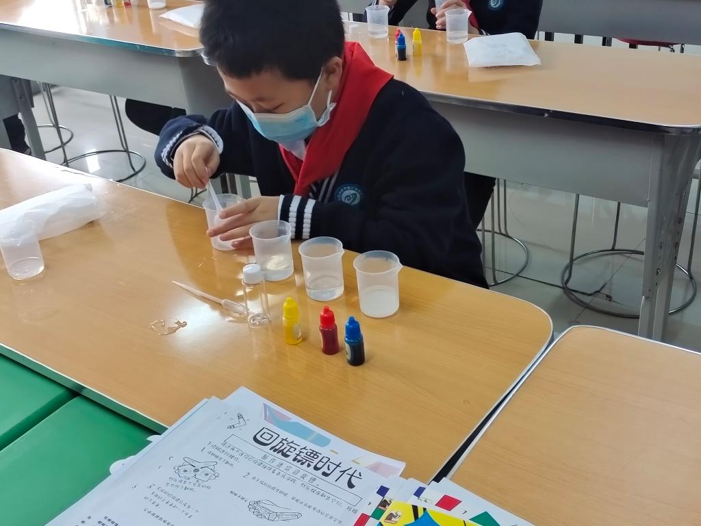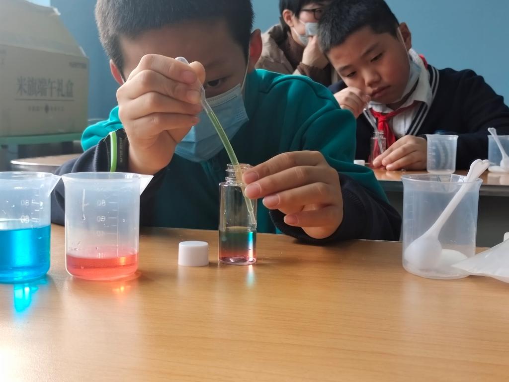 在寒假科普活動活動“鹽的七彩世界”中,在科普輔導員的帶領下,小朋友們開啟了科學之旅。首先,在3個量杯中分別倒入了80毫升的水;之后,在其中2個量杯中分別倒入半勺和一勺鹽,再分別滴入10滴藍、紅、黃色素并攪拌;最后,再把三種液體倒在一個小瓶里。神奇的一幕發生了,小瓶里的三種液體既沒有相互融合,也沒有相互侵染,而是各自靜靜的在小瓶中互不干涉。