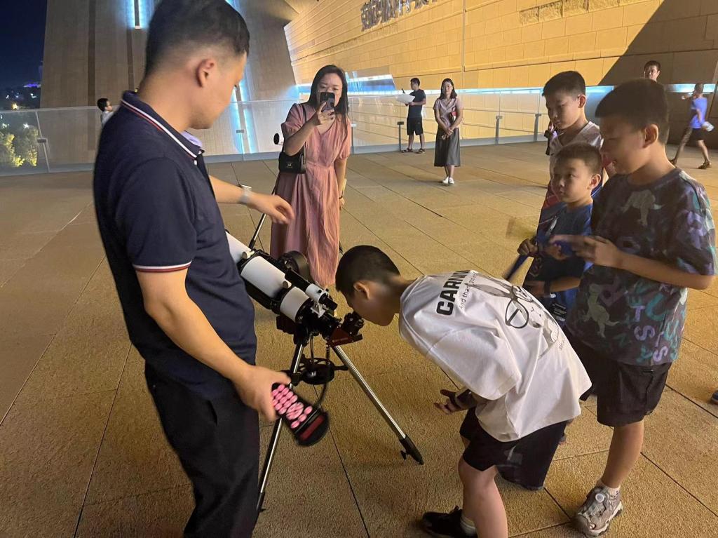 月升日落,追星逐夢之旅最終在天文望遠鏡觀測實操中推向了高潮。每組家庭根據天文科普老師的指導,在科技館觀景平臺依托天文望遠鏡觀察夜空?!霸瓉碓虑蛏蠜]有兔子,那些仿佛是搗藥兔子的輪廓都是月球上的環形山”,賈梓辰同學激動地說,“今天的觀星活動真的太有意思了,我不僅學到了好多的知識,還第一次見到了這么大的月亮、銀河和眾多的繁星”。此次活動累計有30組家庭近100人參與,每組家庭都對這短暫而又豐富的追星之旅意猶未盡。