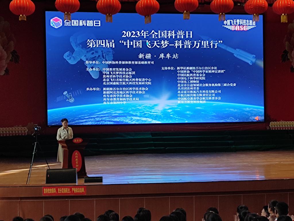 9月7日,2023全國科普日第四屆“中國飛天夢-科普萬里行”科普活動在庫車市第四中學成功舉辦,為1600多名師生帶來了一場精彩的科普盛宴。本次活動由中國教育發展基金會、中國飛天夢科技志愿團、貴州省科協、北京國盛航空航天科技發展研究院主辦,新疆維吾爾自治區科協、阿克蘇地區科協、庫車市科協承辦,庫車市教科局、庫車市第四中學協辦。2023 年第四屆“中國飛天夢-科普萬里行”由中國飛天夢科技志愿團貴州省總隊率貴州志愿者進行出征,全程對青少年進行航空航天科學普及,樹立青少年航空航天報國精神,培養“為祖國,去飛行”的情懷,激發青少年在對天空探索的同時樹立愛學習、愛科學、學科學、愛祖國的奮斗目標本屆活動主題為“強化科技發展,共筑鄉村振興”。
