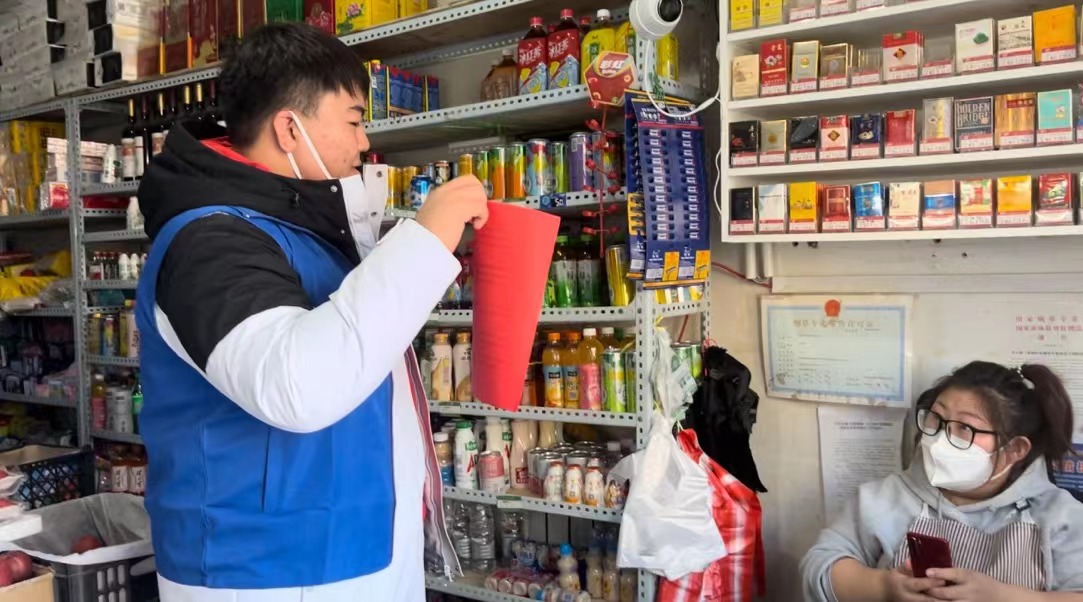 工作人員走進(jìn)商鋪、理發(fā)店、烘焙店等公眾場(chǎng)合,向店主科普售賣商品時(shí)要注意提醒顧客保持1米以上安全社交距離,商品上貨前需仔細(xì)進(jìn)行消殺等注意事項(xiàng)。