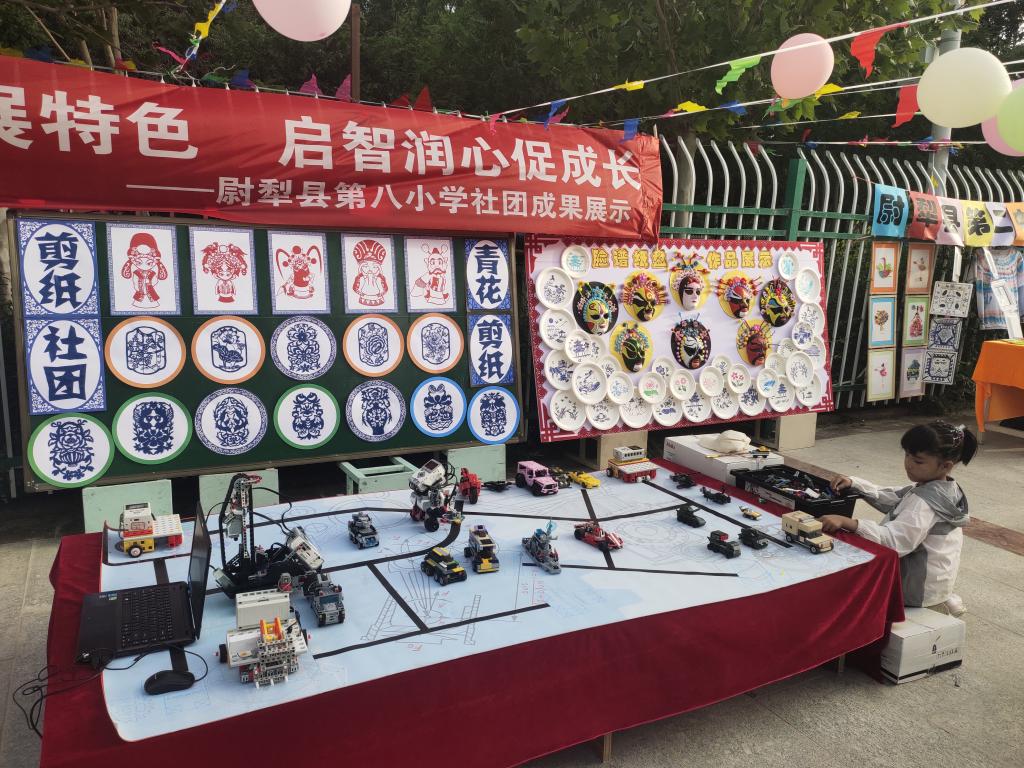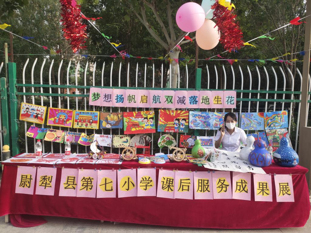 尉犁縣科協聯合縣教科局組織各學校在希望廣場開展課后服務作品展。
