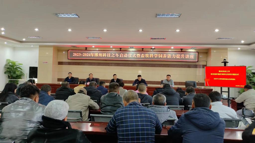 11月28日,博州“科技之冬”啟動儀式在溫泉縣畜牧局會議室舉行。博州科協主席梁文明、新疆生產建設兵團第五師科協主席甫·巴特爾、石河子大學動物科技學院黨委副書記郭玉堂、王新峰教授、蔣松副教授以及新疆縱海佳慧飼料加工有限公司總經理高惠出席啟動儀式。新疆生產建設兵團第五師88團、溫泉縣養殖大戶及溫泉縣各鄉鎮(場)畜牧獸醫站技術人員和溫泉縣相關單位人員參加啟動儀式。