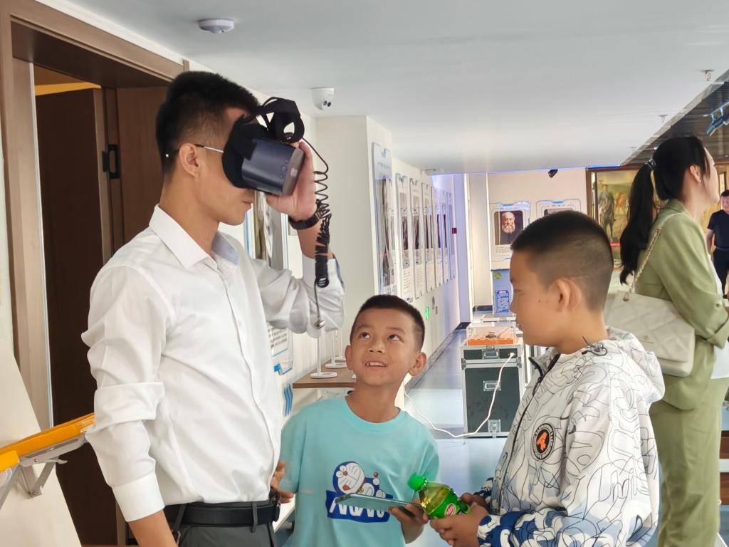 科技館展區分為展示探索經典物理學的聲、光、電的實驗探索區、通過先進科技力量親身體驗地震、龍卷風等自然災害模擬場景的VR體驗區、無人機展演區和觀察細胞結構特征的微觀世界區。在VR體驗區有不少“小客人”排著隊等候體驗。
