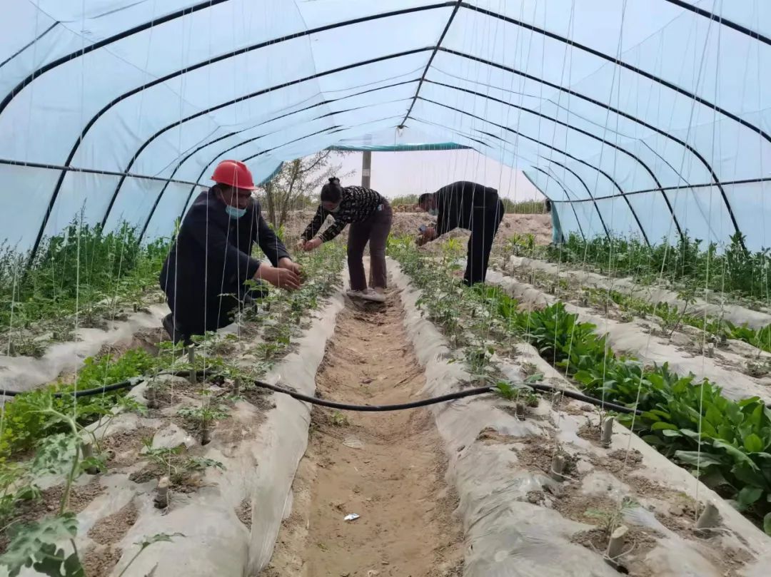 走進阿拉庫姆力克(17)村2組村民帕太木·圖拉麥提家的拱棚,一片翠綠映入眼簾,拱棚內的西瓜苗正煥發著勃勃生機,帕太木·圖拉麥提正在拱棚里忙著給西瓜苗培土。