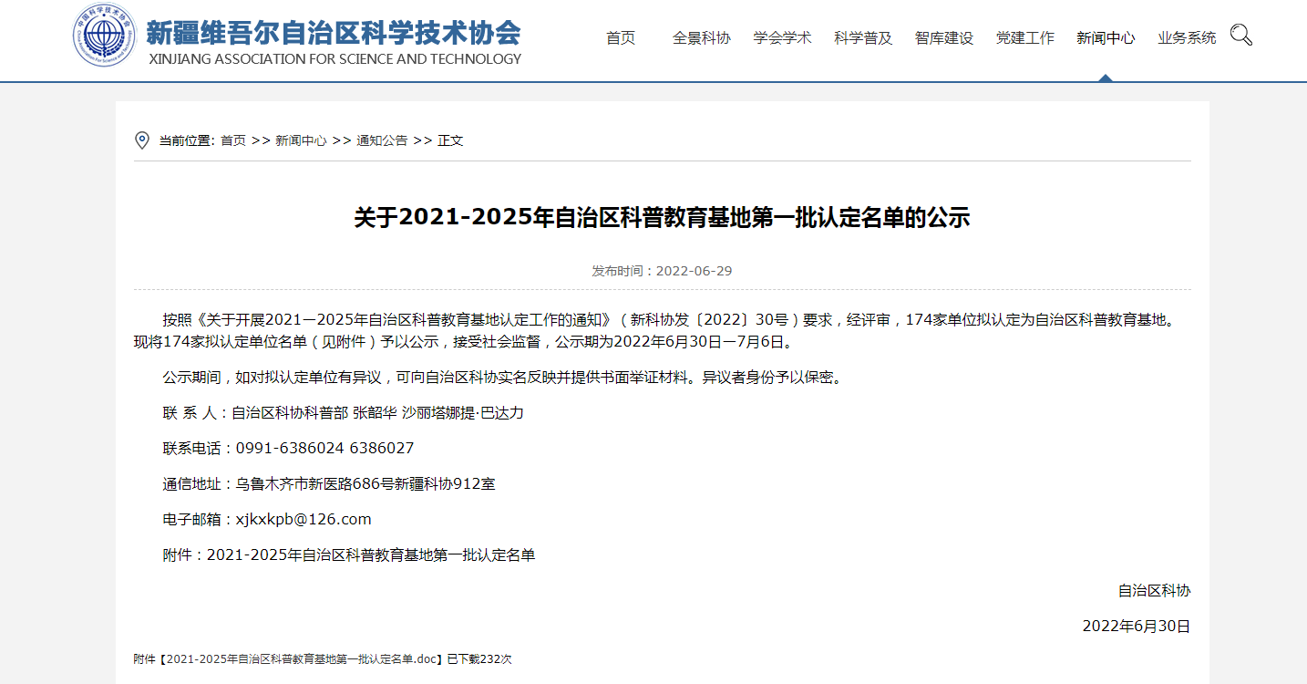 近日,自治區(qū)科協(xié)公布了“2021-2025年自治區(qū)科普教育基地第一批認(rèn)定名單”,174家單位擬認(rèn)定為自治區(qū)第一批科普教育基地。新疆朗青畜牧有限公司、新疆笑廚食品有限公司、昌吉恐龍館等7家單位由昌吉市科協(xié)推薦,經(jīng)初審、專家評(píng)審、終審等評(píng)審和調(diào)研環(huán)節(jié),上榜2021-2025年自治區(qū)科普教育基地名錄。