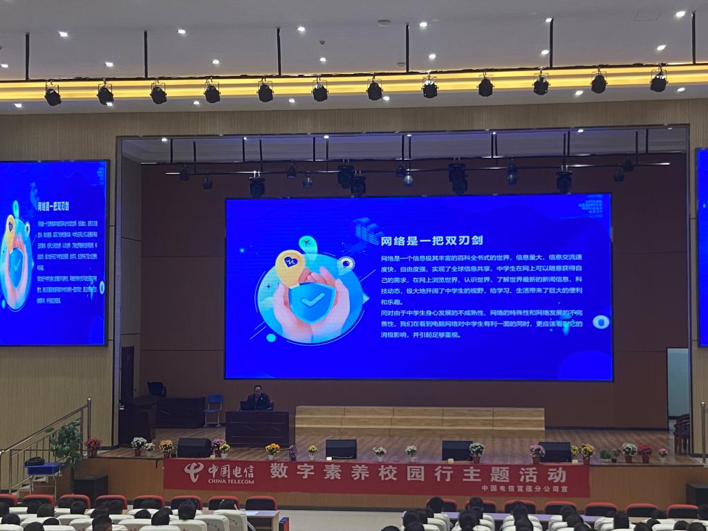 活動中,數字素養與技能提升宣傳員走進縣一中,向廣大師生播放網絡安全宣傳片,并重點以“數字賦能 全民共享”為主題,圍繞運用數字技能、提高網絡文明素養、防范網絡沉迷等方面開展互動式、啟發式、鼓勵式宣講,積極引導師生在使用數字技術、享受數字化發展的同時健康上網、文明上網、安全上網。