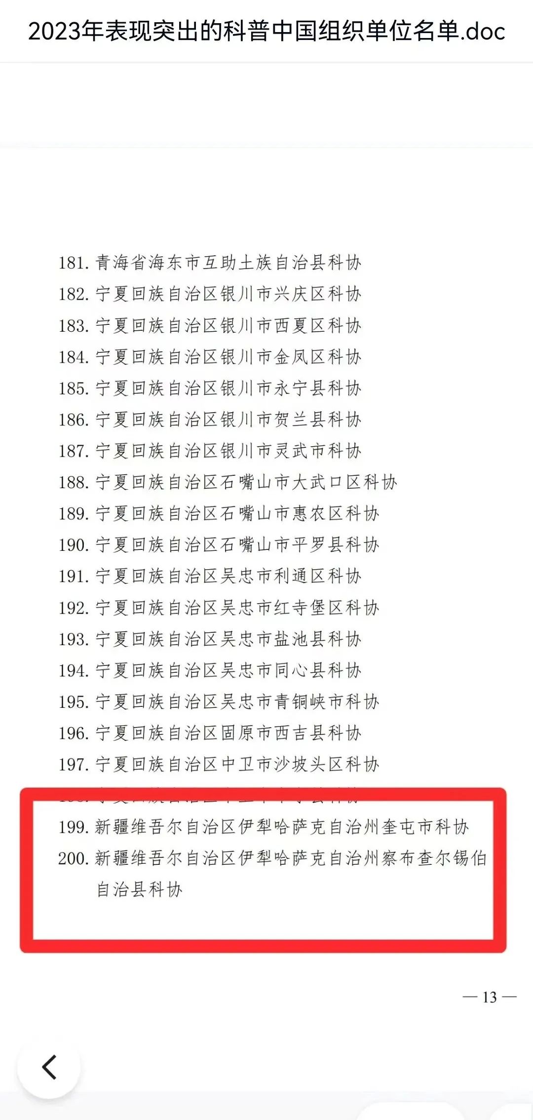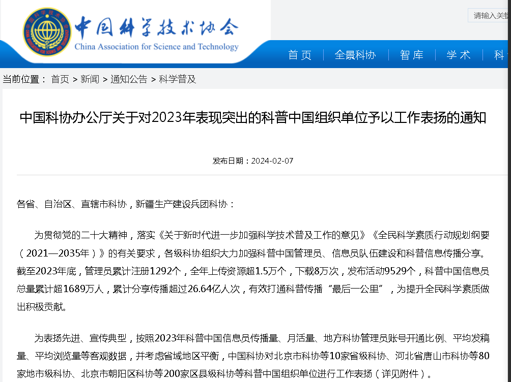 2024年2月7日,中國科協官網發布《中國科協辦公廳關于對2023年表現突出的科普中國組織單位予以工作表揚的通知》,依據“科普中國”官方平臺信息員注冊量、月活量、傳播量等數據,對10家省級科協、80家地市級科協、200家區縣級科協進行工作表揚,奎屯市科協獲評2023年表現突出的科普中國組織單位。