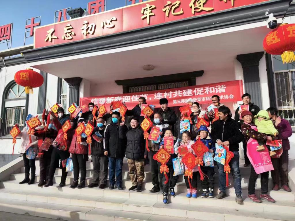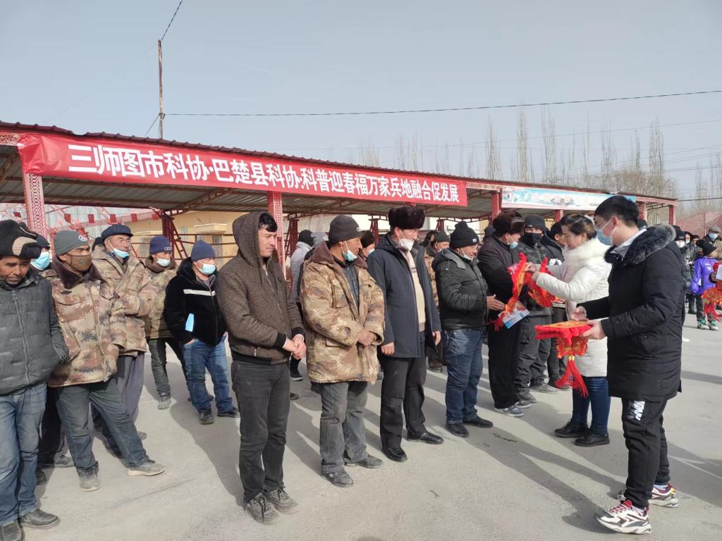 活動最后,兵團第三師科協、巴楚縣科協與巴楚縣阿克薩克馬熱勒鄉博爾其墩(12村)、48團5連先后開展迎新春趣味活動,通過提問中華民族傳統節日特點、四大發明、科普常識等問題,向答對的群眾發放中國結、對聯、洗衣服等獎品,通過快樂的互動將中華民族共同體意識融入大家心中。