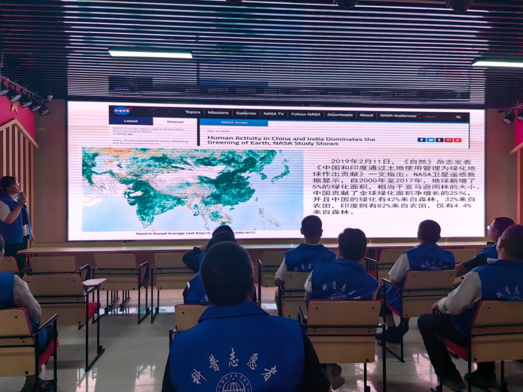 活動現場工作人員利用LED電子顯示屏滾動播放防治荒漠化知識科普,大力宣傳造林綠化對保護生態環境的重要意義。