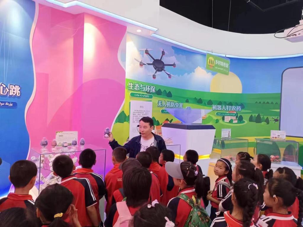 在和什力克鄉下和什力克村科普館,來自庫爾勒市第四小學四年級的50余名小學生在講解員的認真講解下,了解了人與自然的關系、生態環境保護的重要性及必要性、公共安全的必備知識、智慧生活下的信息安全、鄉村特色等知識和鄉村振興成果。伊曼古麗·司馬義是和什力克鄉中學學校教師,今天專門帶領第四小學學生再次來村科普館參觀和學習,一起感受科技為我們的生活帶來的種種便利。