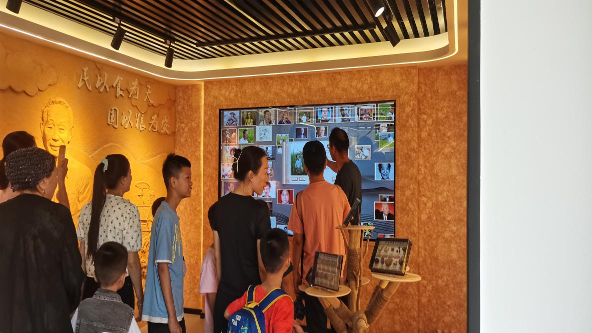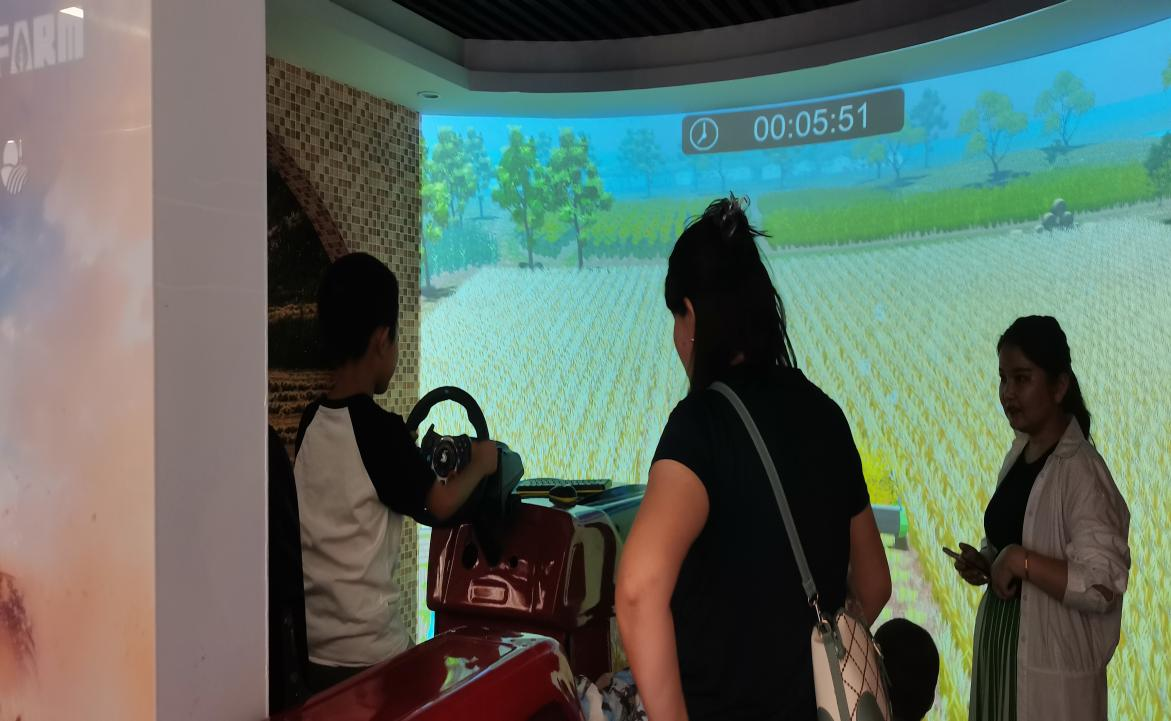 在農業科技館中,講解員通過科技大屏向青少年們介紹二十四節氣、名人使館、昆蟲種類和中藥種類等農業知識,并引導青少年使用VR操作臺體驗割麥子的操作。