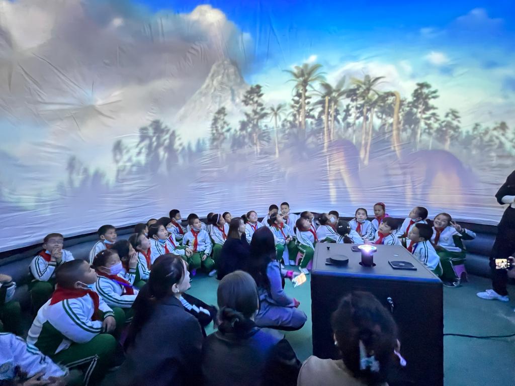 活動現場,首先通過讓青少年們參觀科技館“萬花筒”“魔鏡屋”等展品展具,以直觀互動的形式學習科技相關知識。其次,在科技館講解員的帶領下,青少年們觀看了“阿爾法”機器人表演與球幕電影《恐龍的滅絕》,體驗VR眼鏡等,使青少年在體驗中感受科技的神奇與奧秘,培養他們對科學的熱愛。最后,學生及家長在塔城市科技館門前合影留念。