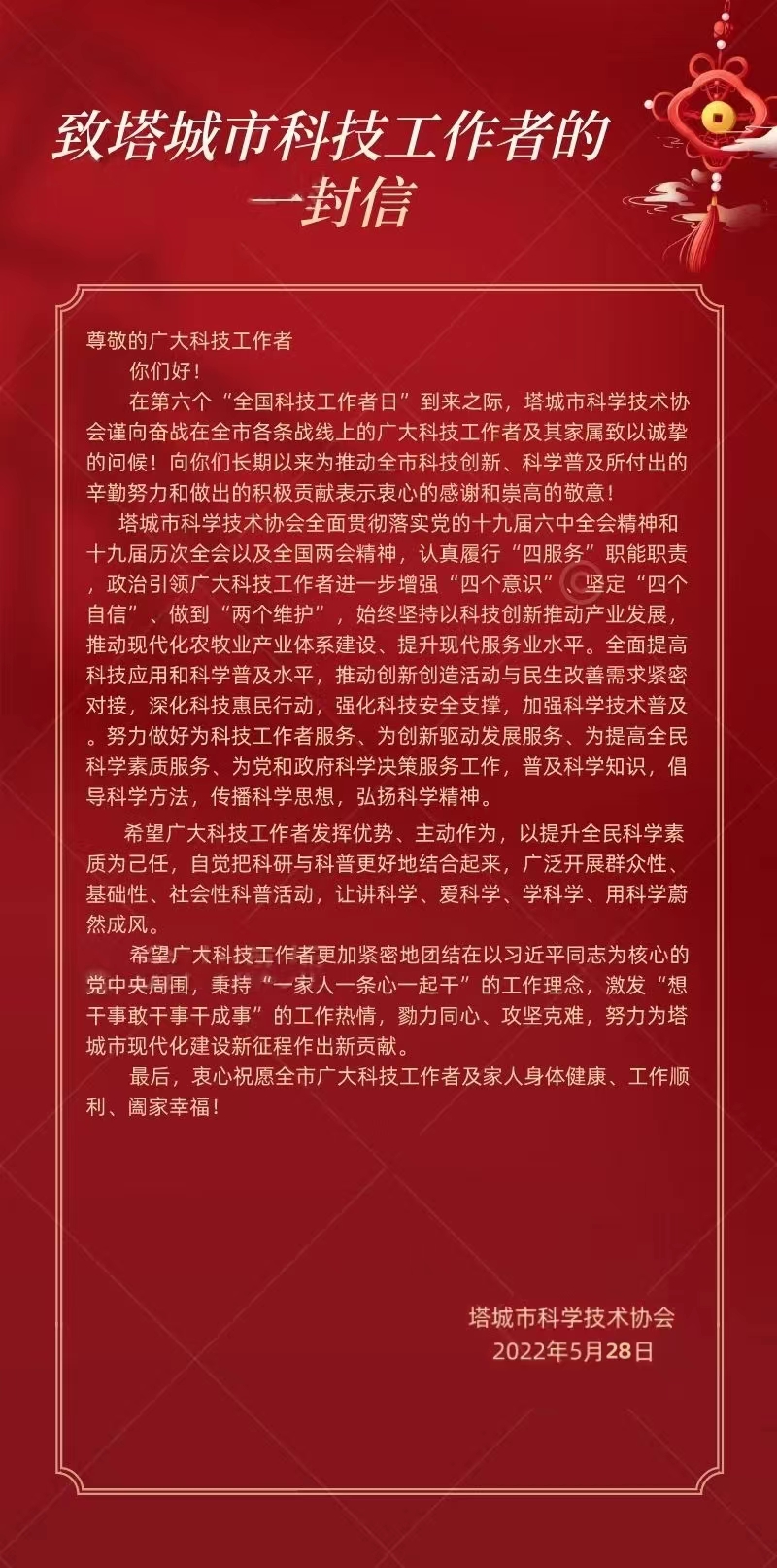 在5月30日第六個“全國科技工作者日”來臨之際,塔城市科協(xié)在全市范圍內(nèi)組織開展系列宣傳活動,為科技工作者獻上誠摯的節(jié)日祝福。