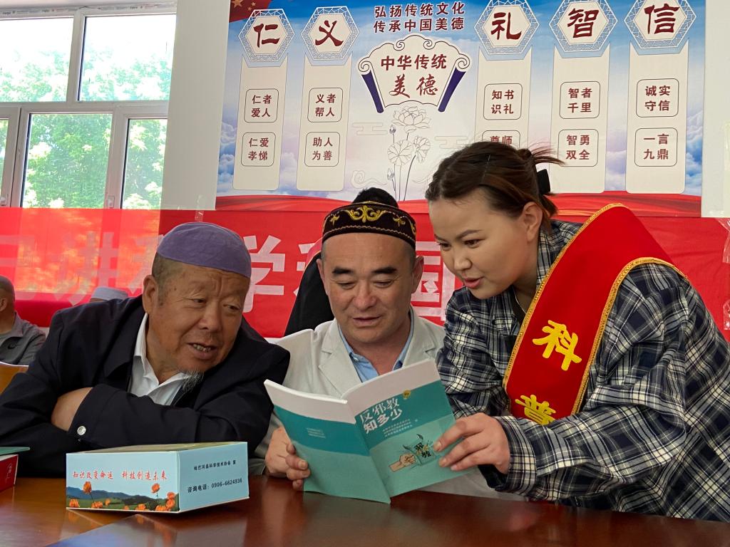 活動現場,工作人員通過懸掛橫幅、發放宣傳單、手冊,現場互動等方式,用通俗易懂的語言向愛國宗教人士和信教群眾宣講了《去極端化條例》《新疆維吾爾自治區社會科學普及條例》《宗教政策法規知識》等法律法規和科普宣傳材料,發放《食品安全》《健康飲食》《生物質利用與環境保護》《反封建迷信》等各類科普宣傳材料共600余份。