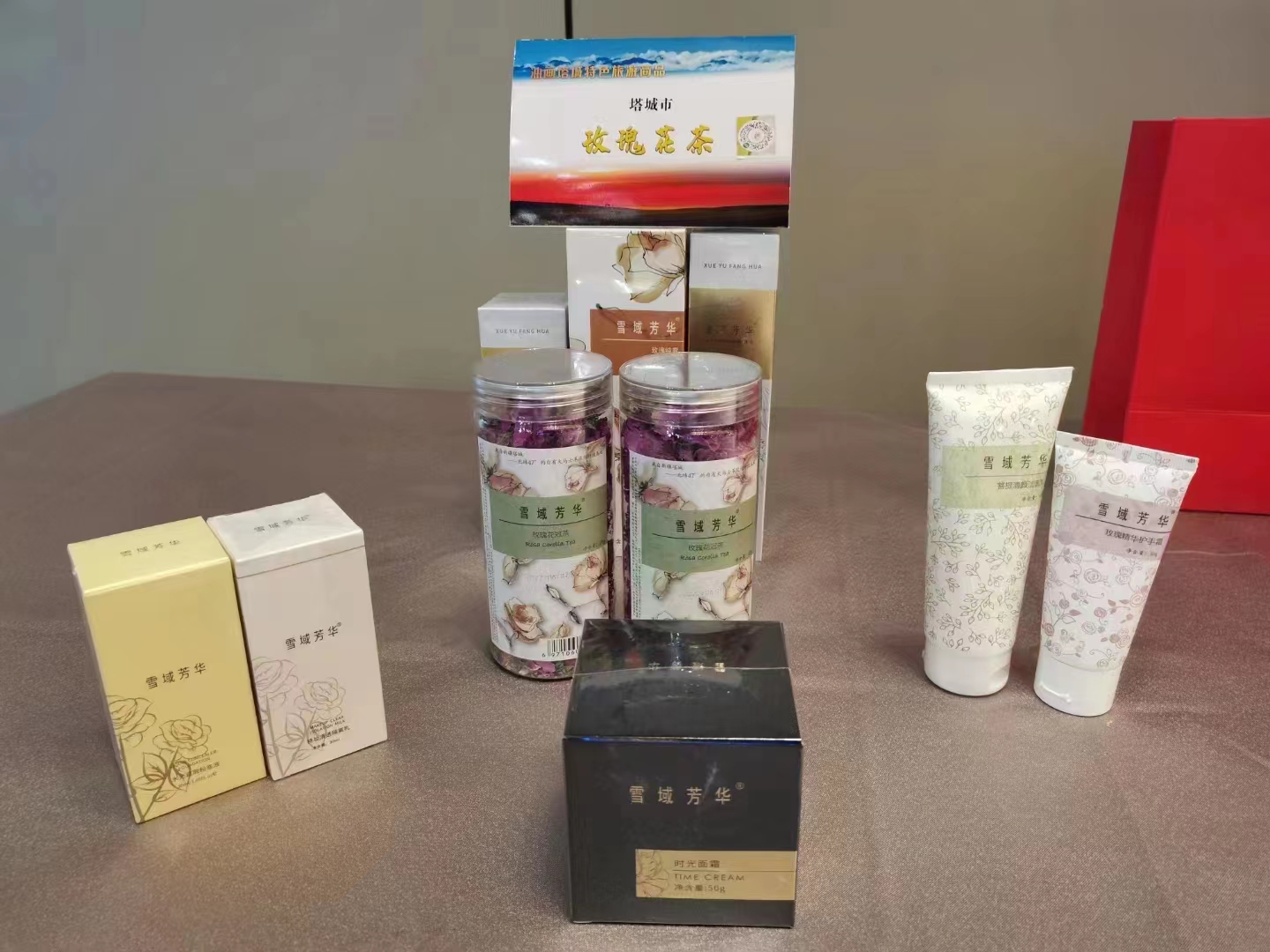 推介會上,塔城地區精心挑選塔城市雪域芳華玫瑰、塔塔爾族傳統糕點、俄羅斯族冰淇淋、塔城風干肉、哈薩克族奶疙瘩、沙灣大盤雞、裕民縣巴什拜羔羊肉、烏蘇柳花茶等40余種特色產品參展,吸引了不少中外客商觀看、咨詢和采購。其中,塔城市科協科普示范基地——塔城市恒翌生物科技開發有限公司(雪域芳華玫瑰基地)作為塔城市代表參加此次推介會。此次參展商品主要包括:玫瑰花茶、玫瑰花醬、玫瑰純露、玫瑰精油、玫瑰精華乳、玫瑰精華霜、玫瑰精油護手霜、眼霜、洗面奶等系列玫瑰產品。