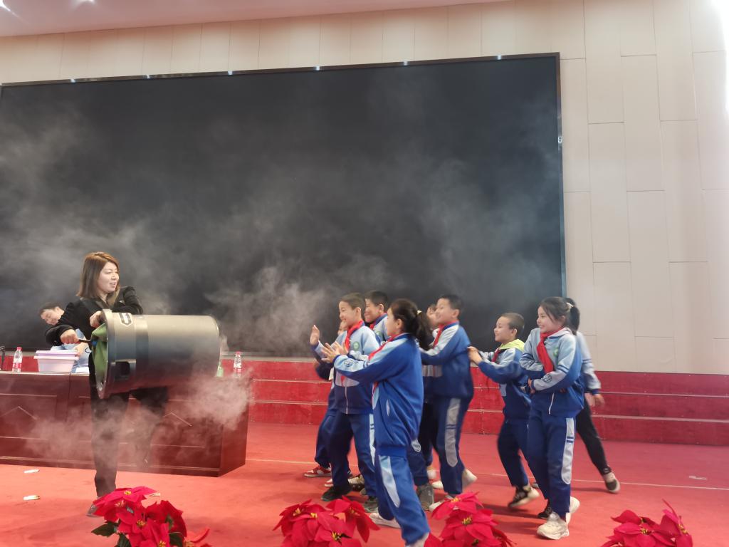 活動(dòng)開(kāi)始,阿克蘇新東方智慧教育老師叮當(dāng)老師和小敏老師通過(guò)生動(dòng)有趣的語(yǔ)言激發(fā)學(xué)生興趣,調(diào)動(dòng)學(xué)生的參與性、積極性。隨后,兩位老師帶著同學(xué)們開(kāi)啟探索之旅。開(kāi)始演示火焰掌,用浸濕的手捧起一堆帶有丁烷氣的氣泡在手心的時(shí)候,一點(diǎn)燃它就著火了。同學(xué)們看見(jiàn)之后驚訝地大呼,“好厲害啊”“手不痛嗎”……并躍躍欲試,爭(zhēng)先恐后地舉手,也想體驗(yàn)一下火焰掌。叮當(dāng)老師選了五位同學(xué)上臺(tái)體驗(yàn),親身體驗(yàn)之后,他們覺(jué)得很爽,手一點(diǎn)也不痛,很好玩啊!體驗(yàn)完后,兩位老師詳細(xì)講解火焰掌的原理,帶著同學(xué)們探索科學(xué)世界的奧秘,接著,老師們又邀請(qǐng)同學(xué)們共同向大家展示空氣炮、馬德堡半球、液氮、“消失的顏色”等科學(xué)趣味小實(shí)驗(yàn),并介紹其科學(xué)原理,開(kāi)啟同學(xué)們探索科學(xué)世界的興趣。整個(gè)活動(dòng)過(guò)程中,學(xué)生們歡笑聲、驚訝聲不斷,現(xiàn)場(chǎng)氣氛熱烈。學(xué)生們近距離接觸并感受到了科學(xué)的趣味,領(lǐng)略了科學(xué)的神奇,實(shí)實(shí)在在地過(guò)了一把“科學(xué)癮”。