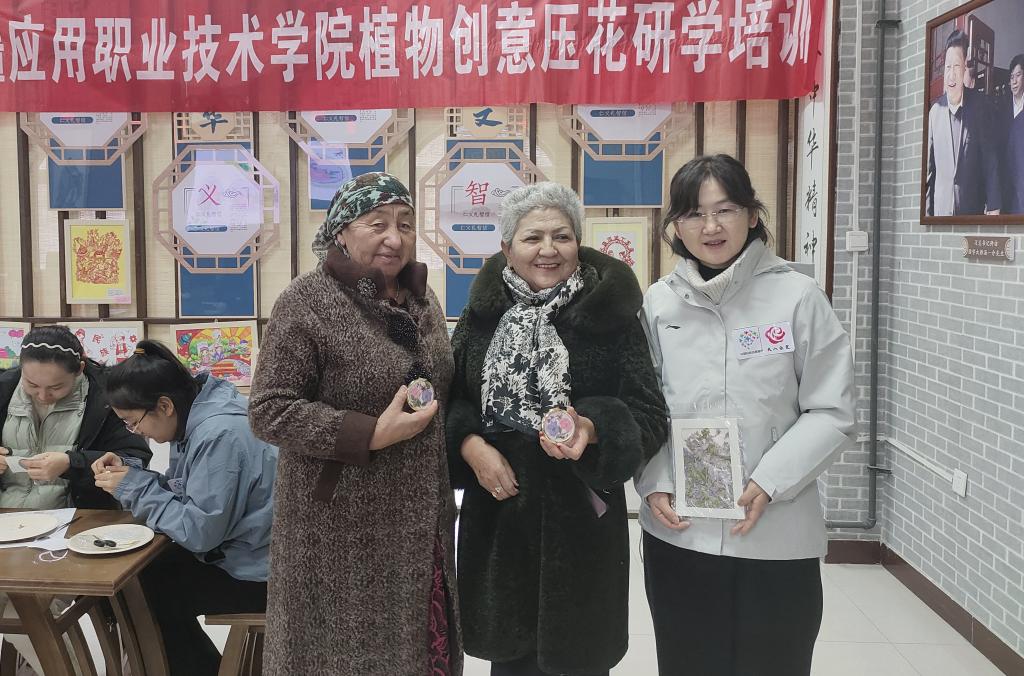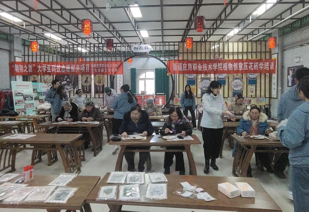活動中,新疆應用職業(yè)技術學院“藝術壓花工作室”科普志愿服務隊向開干齊鄉(xiāng)的農(nóng)牧民詳細介紹了壓花作品制作的流程、注意事項,帶領農(nóng)牧民嘗試制作化妝鏡面“畫”。