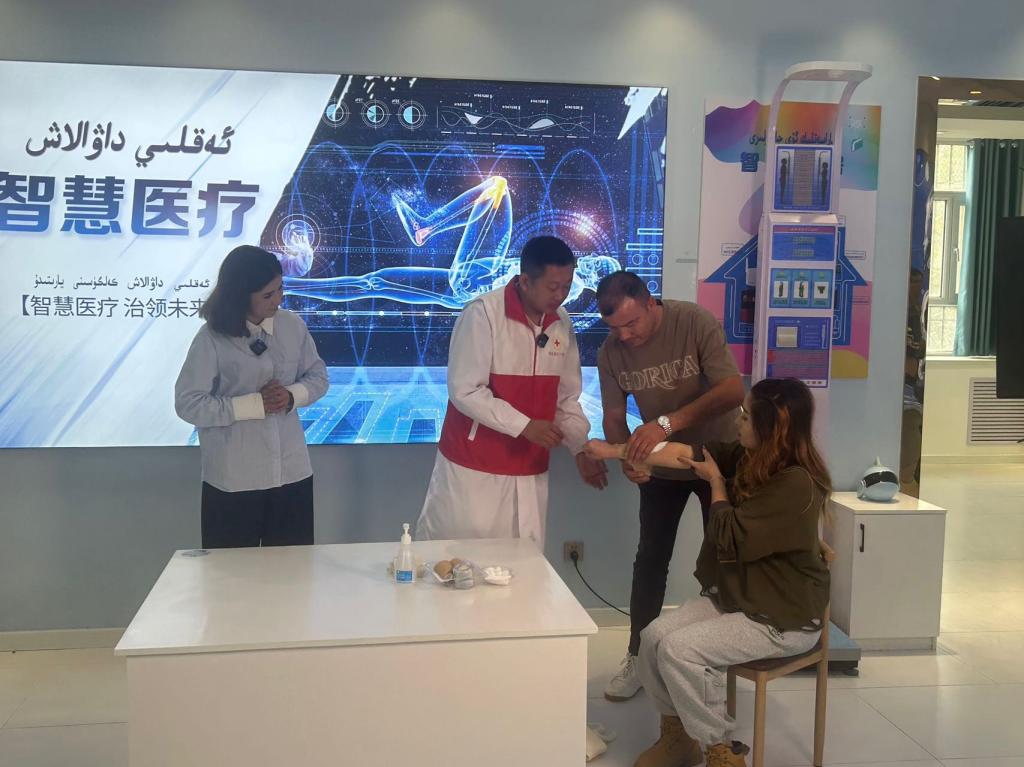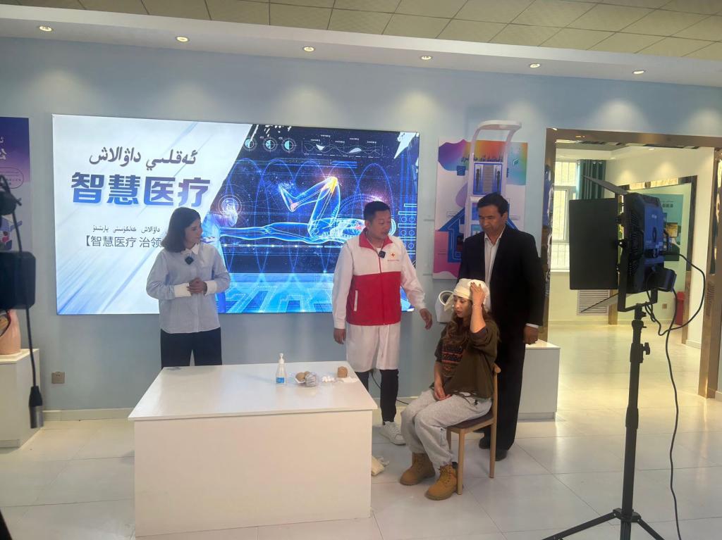 活動包括參觀體驗、急救知識講座及農牧民外傷急救技能展示等三個內容。參觀體驗中,農牧民群眾有序走進科普館,參觀體驗“應急安全”流動科普展品,認真了解其中的科學原理,感受科技魅力;在急救知識講座直播現場,輪臺縣濟民醫院院長齊博向大家講述學習應急救護知識的必要性,普及了外傷急救繃帶包扎方法,并對每一個操作步驟進行了詳細的演示,重點說明了適用場景、施救方法等,并邀請參觀觀眾現場演練實際操作。現場講解和演示,引起了大家的共鳴,大家都積極配合,現場反響熱烈。