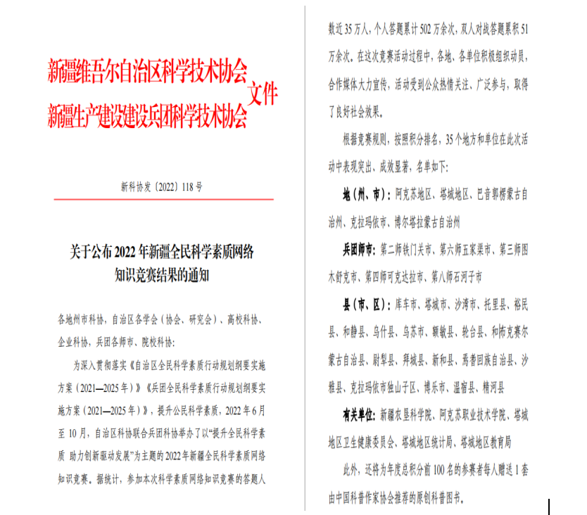 近日,自治區科協聯合新疆生產建設兵團科協聯合發文,公布了2022年新疆全民科學素質網絡知識競賽結果,輪臺縣在競賽活動中表現突出、組織有力,成效顯著,已連續兩年獲得通報表揚。