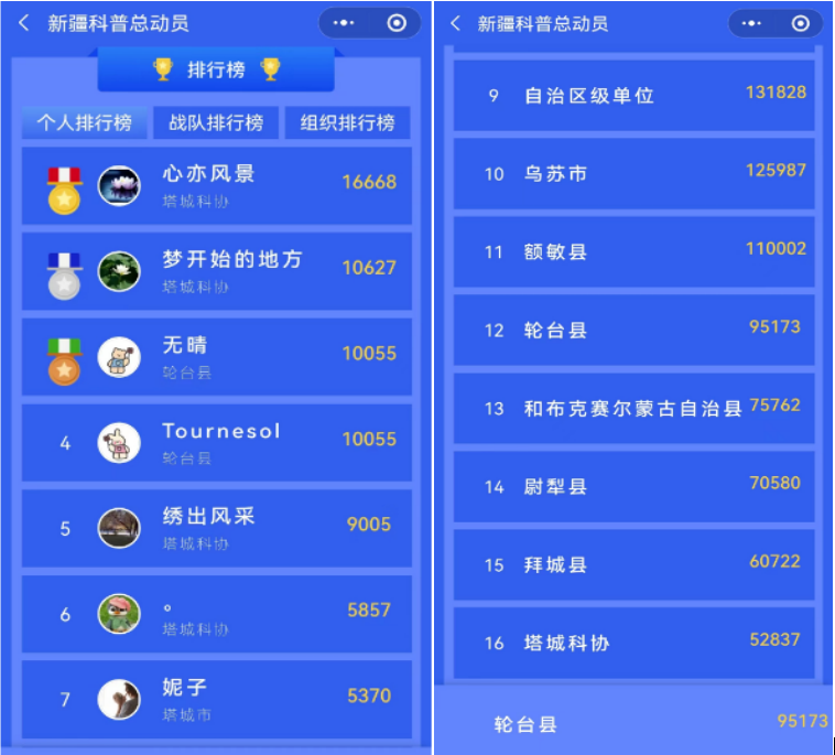 本次全民科學素質網絡知識競賽中,在全縣公眾的共同努力下,輪臺縣年度總積分達95173分,其中網名為“無晴”、“Tournesol”的兩名參賽者實力超群,總積分達10055分,以全疆排名第三和第四的成績,獲得由中國科普作家協會推薦的原創科普圖書1套。