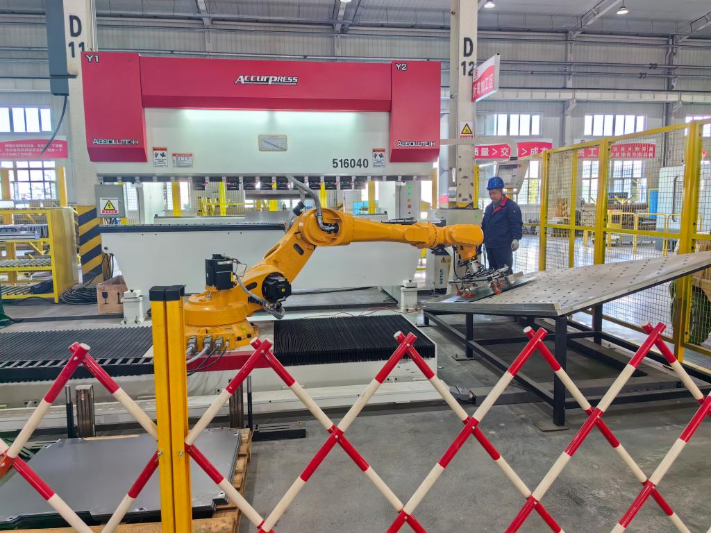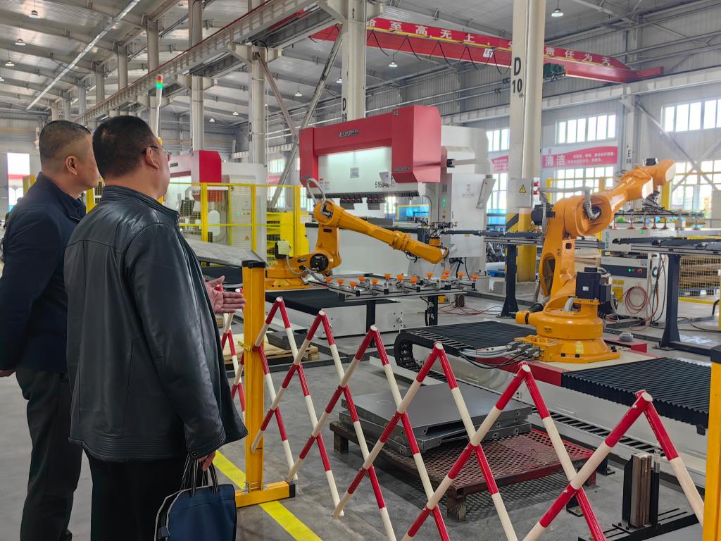 5月5日,新疆缽施然農業機械科技有限公司零件壓沖工段,多臺機械臂正在對采棉機需要的產品進行全自動生產。