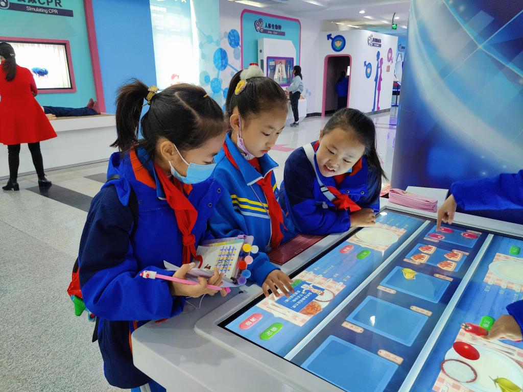 進入展廳,同學們更是在知識的海洋遨游。有的同學感受著“生命的孕育”的奇特,有的同學認真學習人類膳食平衡搭配,有的同學在測試人體平衡力,有的同學模擬體驗海姆立克急救法,心肺復蘇等。一個個科普展品讓孩子們應接不暇,他們在看、在記錄、在思考,一雙雙眼睛亮亮的,閃耀著求知的渴望。