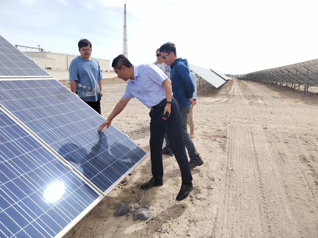 科考隊一行深入楓霖電力科技、源興能源等企業光伏園查看光伏電力規模、能效發揮、沙害影響情況,采集地表沙樣本、光伏板沙塵樣本,并同相關企業技術人員交流,了解沙害對光伏板采光轉換電能影響,目前采取應對措施,并就應對沙塵影響提出指導性意見。