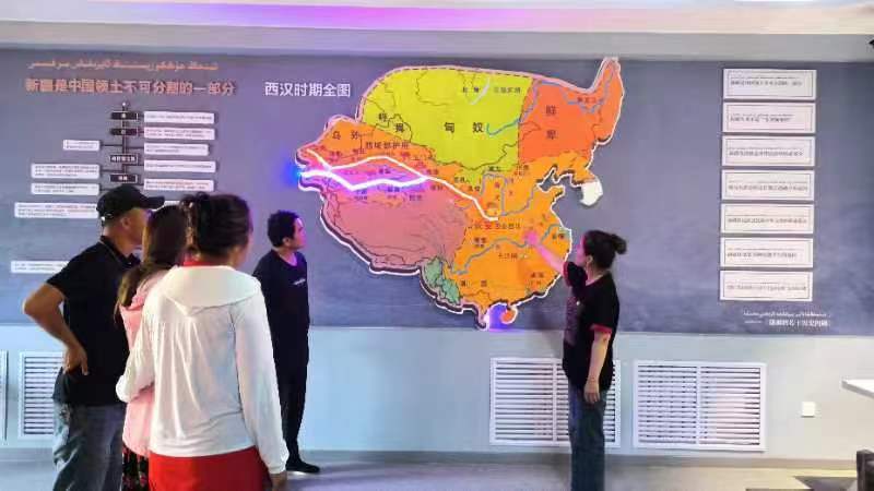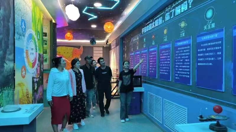活動中,科普講解員引導大家有序觀展,科普旅程第一展區以“歷史”為軸,通過時間線與西漢地圖梳理新疆歷史,向各族干部群眾宣傳新疆自古就是偉大祖國不可分割的一部分,進一步鑄牢中華民族共同體意識,接著介紹了各個科技展品的組件構成,通過視覺體驗、互動、虛擬影像等方式,向觀覽人員展示科學現象,并結合生活實際解釋包含的科學原理,讓大家生動形象地了解這些現象產生的科學依據。隨后,參觀人員在自己感興趣的展品前親身體驗,零距離體驗科技的魅力,大家紛紛表示,在實際體驗后,對科學知識有了切實的體會,知識真正進到心里了。