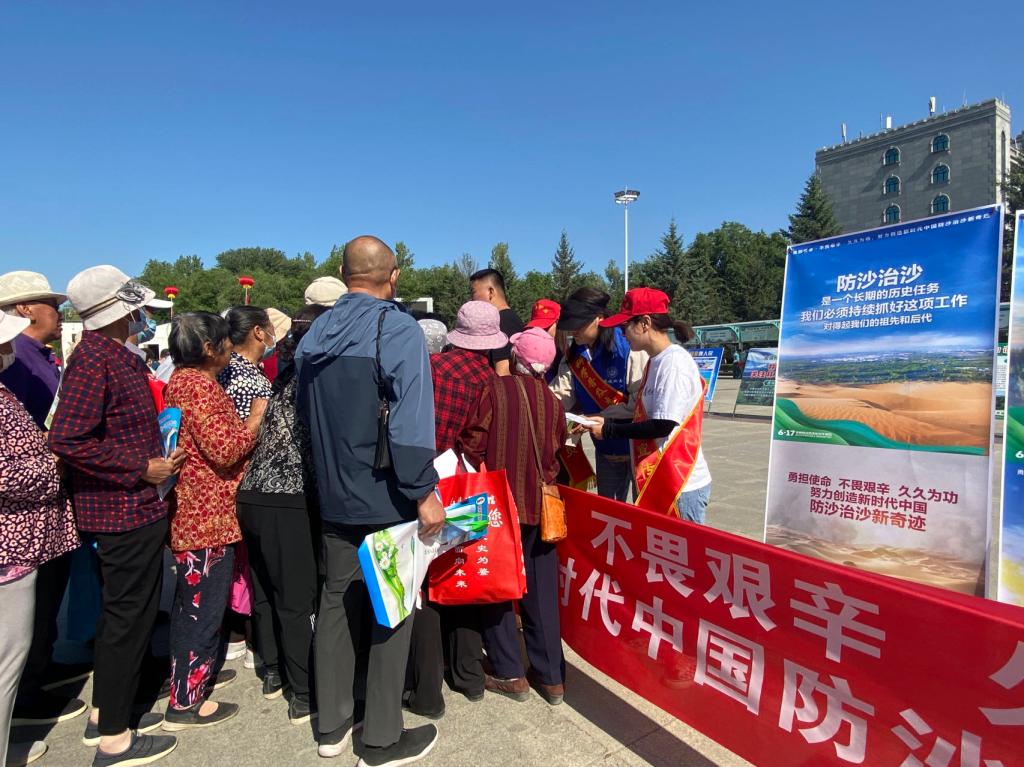 活動(dòng)現(xiàn)場,通過懸掛橫幅、擺放“承擔(dān)使命不畏艱辛 久久為功努力創(chuàng)造新時(shí)代中國防沙治沙新奇跡”海報(bào),為廣大群眾發(fā)放《中華人民共和國防沙治沙法》《中華人民共和國森林法》、全民科學(xué)素質(zhì)筆記本等宣傳資料,供廣大群眾學(xué)習(xí)防沙治沙知識。科普工作者還為現(xiàn)場的群眾宣傳了中國荒漠化防治對全球生態(tài)作出的巨大貢獻(xiàn),講解了防沙治沙相關(guān)知識,希望每個(gè)人都能為防沙治沙事業(yè)作出自己的貢獻(xiàn),在日常生活中,節(jié)約用水、保護(hù)植被、降低環(huán)境污染,從而改善生態(tài)環(huán)境,筑牢生態(tài)安全屏障。