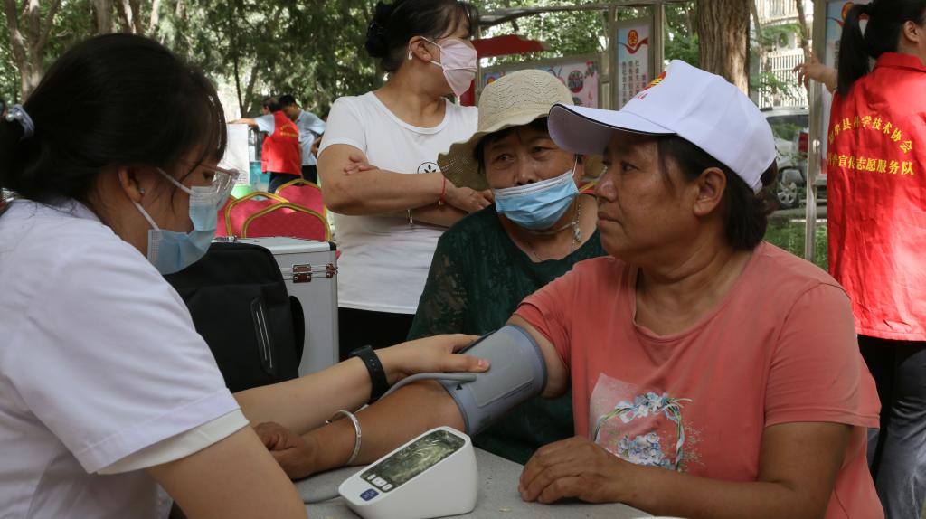 在咨詢臺前縣人民醫院的醫務工作者為廣大居民群眾免費義診,仔細詢問前來咨詢的群眾過往病史,耐心細致地分析病情,解答患者的疑惑并贈送藥品。同時,還向周圍的社區居民講解了傳染病、婦科病、高血壓、心臟病等方面的醫療預防知識。