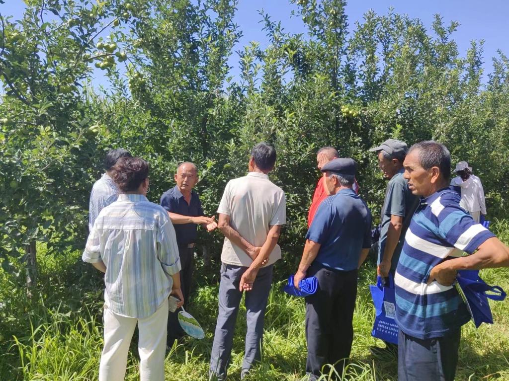 7月23日,霍城縣大西溝新村果農頂著如火的太陽正在學習蘋果田間管理技術。十多戶林果種植戶在聽到消息后,自覺來到果園現場聽講。