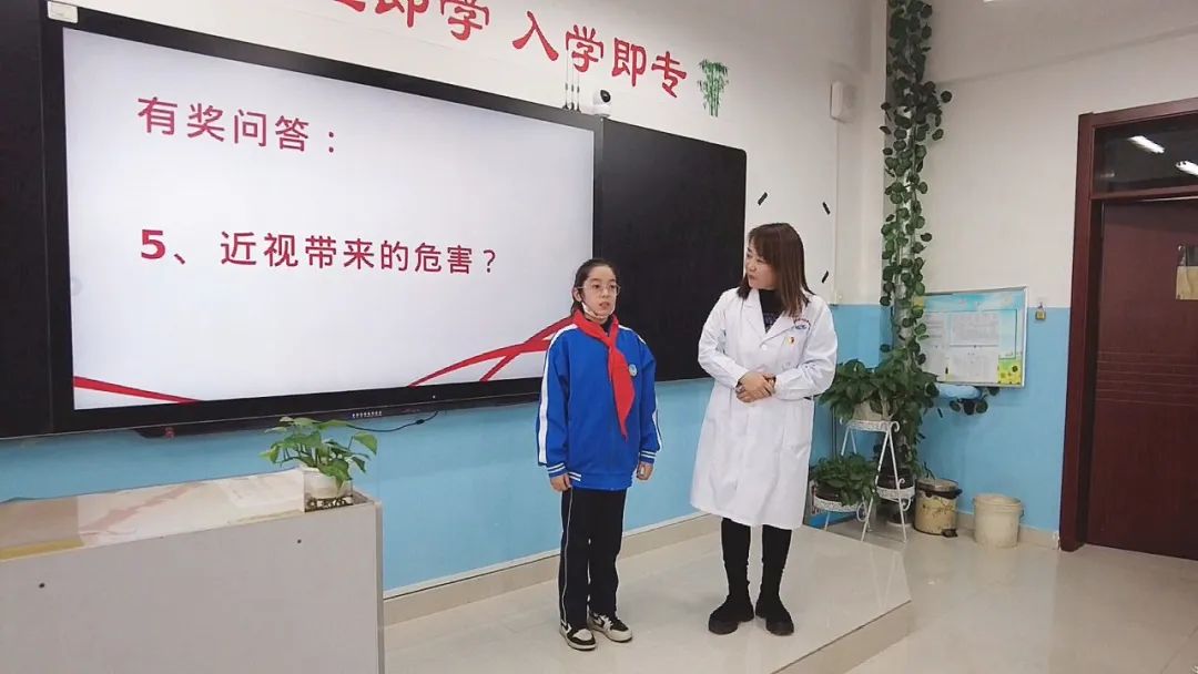 陳玲老師用具體生動的事例、豐富多彩的圖片演示,引導學生了解近視的危害和形成的原因,學習正確的用眼和預防近視的方法,教育學生養成良好的用眼習慣。同時,針對同學們提出的關于用眼方面的疑惑,陳玲老師一一給予耐心解答。