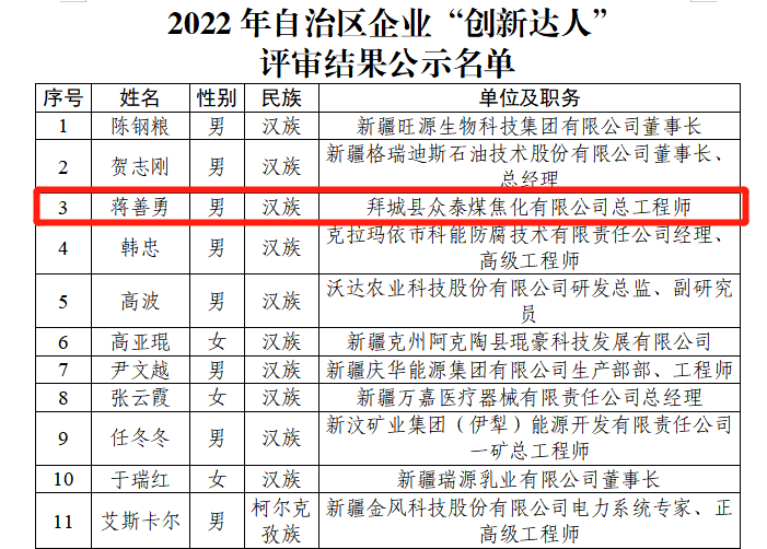 近日,2022年自治區企業“創新達人”評選結果公布,共有來自天山南北的20名企業科技工作者榮膺榜單,其中,拜城縣眾泰煤焦化有限公司總工程師蔣善勇入選,成為拜城縣首位獲此殊榮的科技工作者。