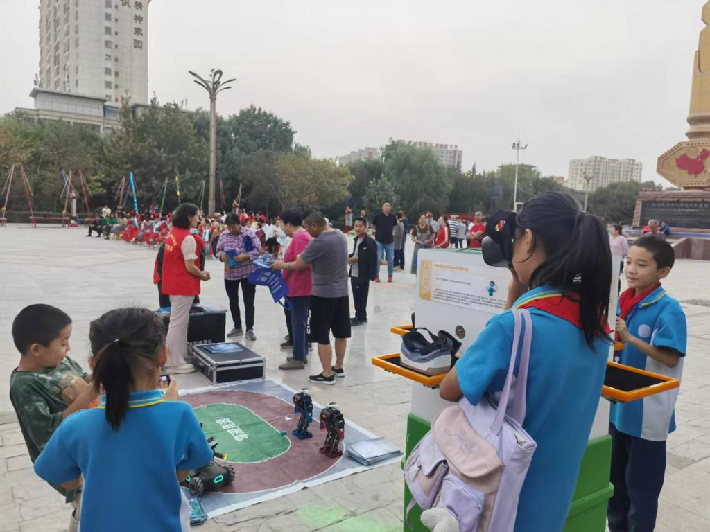 在科普宣傳活動中,科技科普志愿者以懸掛橫幅、機器人、坦克、無人機表演、VR體驗以及發放科普宣傳資料和小禮品的形式,為在場群眾帶來了嶄新的視覺體驗,勾起了他們尤其是青少年對科學知識的好奇心和求知欲。