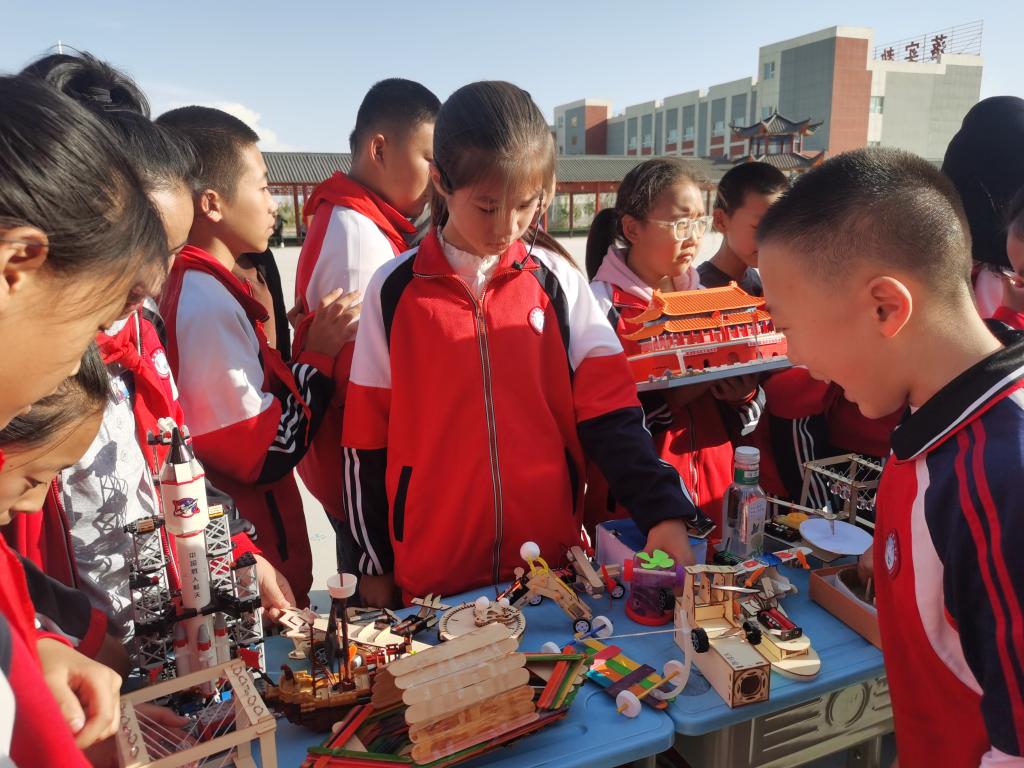 看,科技小制作展示區(qū)為同學(xué)們帶來了航空母艦、筷子小屋、歡樂動物園、發(fā)光小屋、長征一號、易拉罐小火車、天壇、自動升降機......這些科普展品在校園內(nèi)一擺出,便吸引了學(xué)生們的目光,大家這里瞧瞧,那里動動,感到特別的神奇。