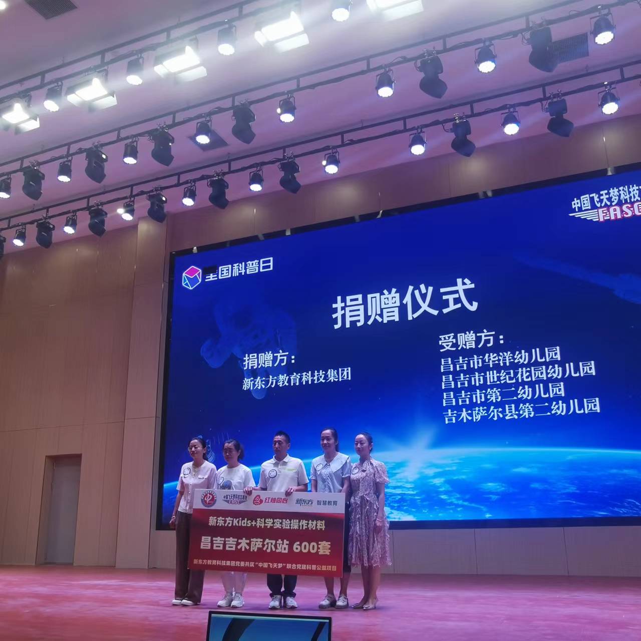 啟動(dòng)儀式由吉木薩爾縣科協(xié)書記玉孜曼主持,昌吉州科協(xié)副主席王彥鵬致辭,吉木薩爾縣人民政府副縣長巴合達(dá)提?霍加合買提宣布活動(dòng)啟動(dòng),吉木薩爾縣第一中學(xué)的30名科技志愿者共同宣誓加入“中國飛天夢科技志愿團(tuán)”。新東方教育科技集團(tuán)、中國教育發(fā)展基金會(huì)等單位對吉木薩爾縣第二幼兒園、昌吉市華洋幼兒園等4所幼兒園進(jìn)行了物資捐贈(zèng),共同為實(shí)現(xiàn)祖國航空航天強(qiáng)國事業(yè)奉獻(xiàn)力量。