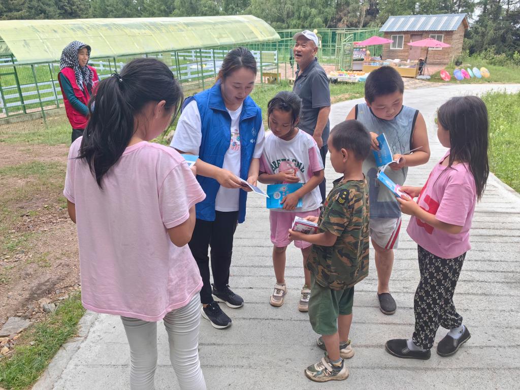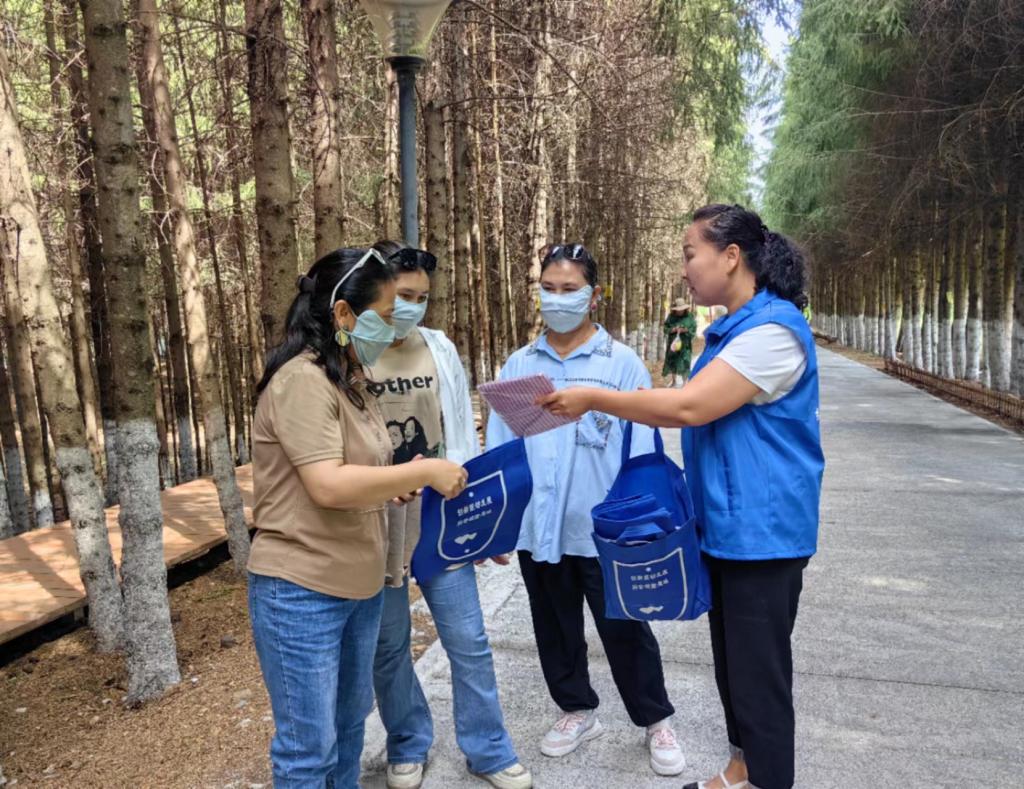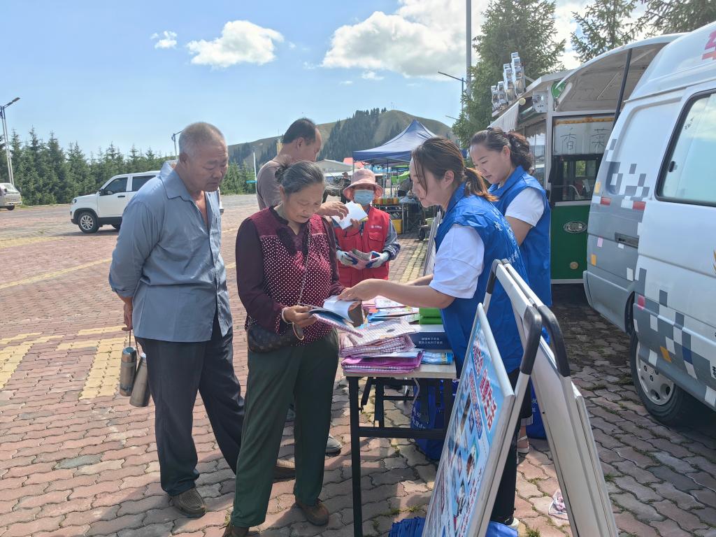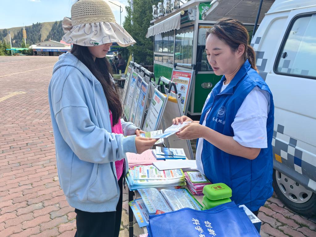 科普大篷車一進景區(qū),立刻就吸引了現(xiàn)場游客的目光,科普志愿者設立咨詢臺,向游客及牧民發(fā)放生態(tài)文明建設宣傳冊、森林消防安全宣傳冊、公勺公筷倡議書及科普健康知識手冊、折頁并擺放應急科普、食品安全、公勺公筷等展板,讓游客們在休閑娛樂的同時,感受科普知識濃厚的氛圍。本次活動發(fā)放宣傳手冊、折頁、“科普圍裙”“科普環(huán)保袋”等科普宣傳資料、宣傳品200余份,受眾達200多人。